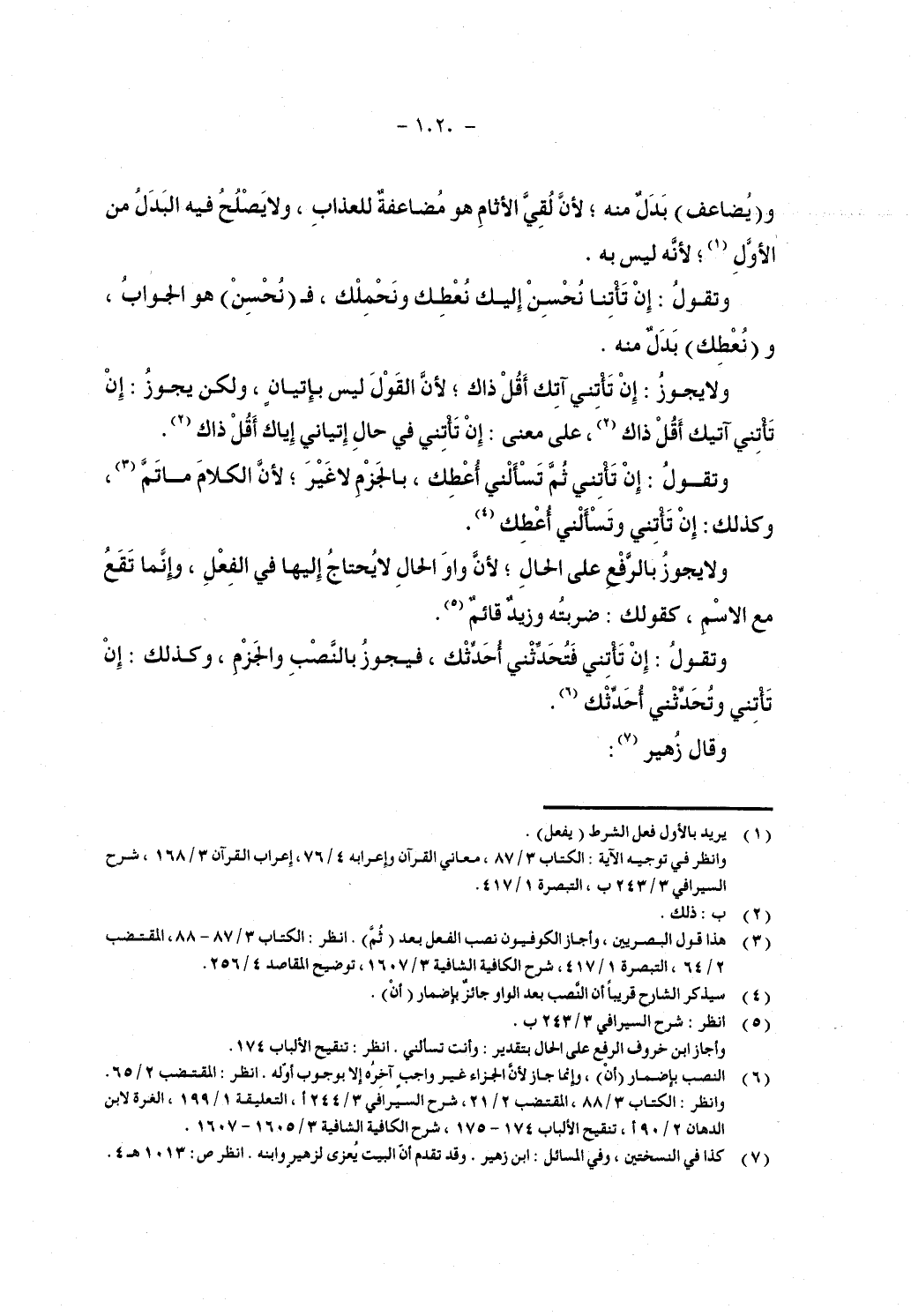 ولا يجوز: إن تأتني آتك أقل ذاك, لأن القول ليس بإتيان, ولكن يجوز: إن تأتني آتيك أقل ذاك, على معنى: إن تأتني في حال إتياني إياك أقل ذاك.
