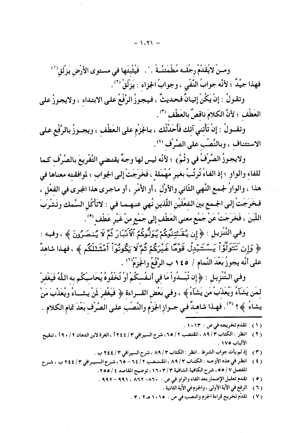 وفي التنزيل: {وَإِنْ تُبْدُوا مَا فِي أَنفُسِكُمْ أَوْ تُخْفُوهُ يُحَاسِبْكُمْ بِهِ اللَّهُ فَيَغْفِرُ لِمَنْ يَشَاءُ وَيُعَذِّبُ مَنْ يَشَاءُ} , وفي بعض القراءة {فَيَغْفِرُ لِمَنْ يَشَاءُ وَيُعَذِّبُ مَنْ يَشَاءُ}؟ فهذا شاهد في جواز الجزم والنصب على الصرف بعد تمام الكلام.