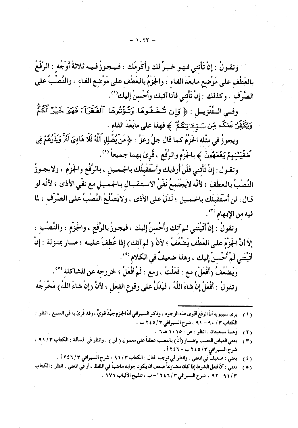 وتقول: إن تأتني فلن أوذيك وأستقبلك بالجميل, بالرفع والجزم, ولا يجوز النصب بالعطف, لأنه لا يجتمع نفي الاستقبال بالجميع مع نفي الأذى, لأنه لو قال: لن أستقبلك بالجميل, لدل على الأذى, ولا يصلح النصب على الصرف, لما فيه من الإبهام.