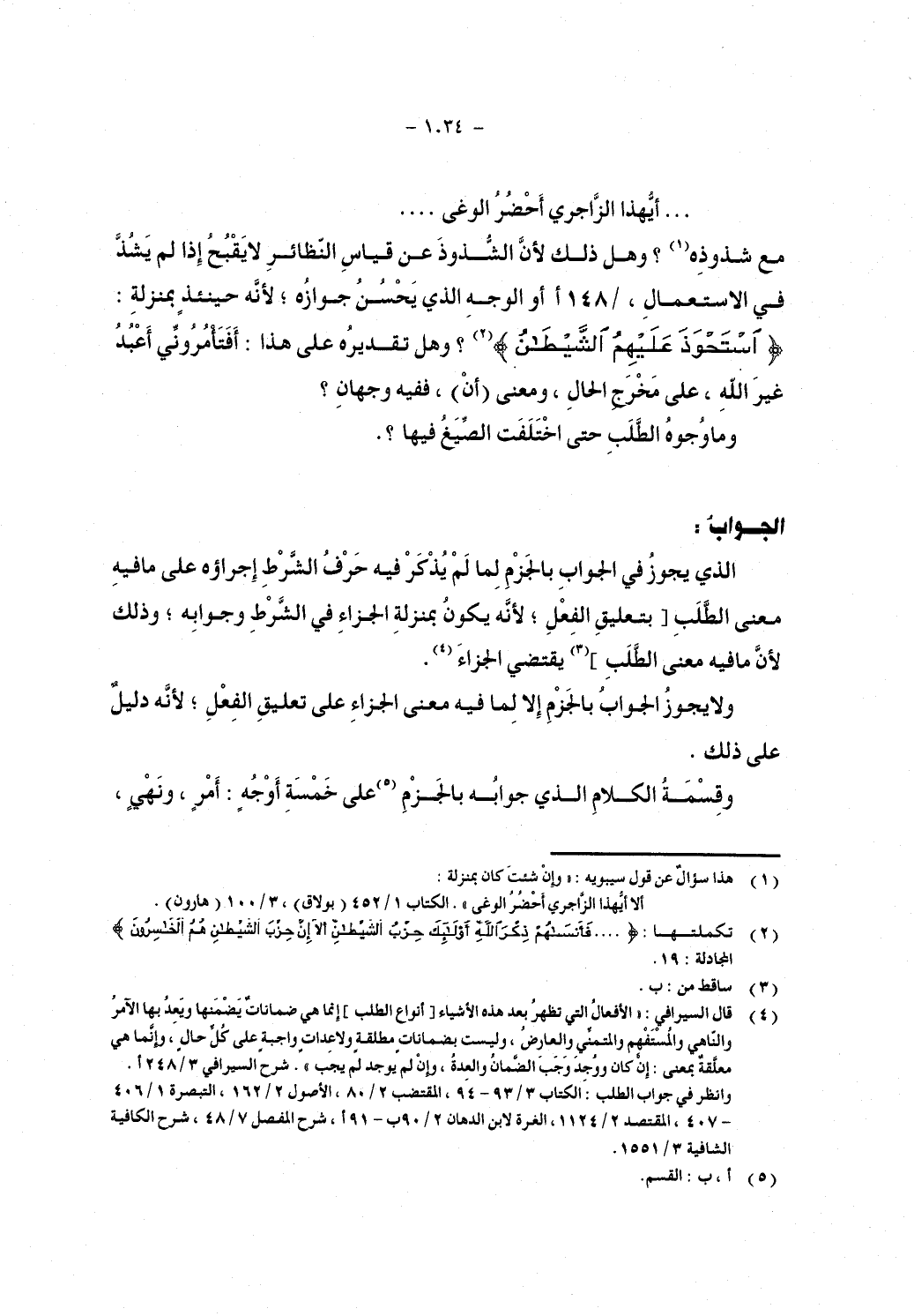 وقسمه الكلام الذي جوابه بالجزم على خمسة أوجه: أمر, ونهي,