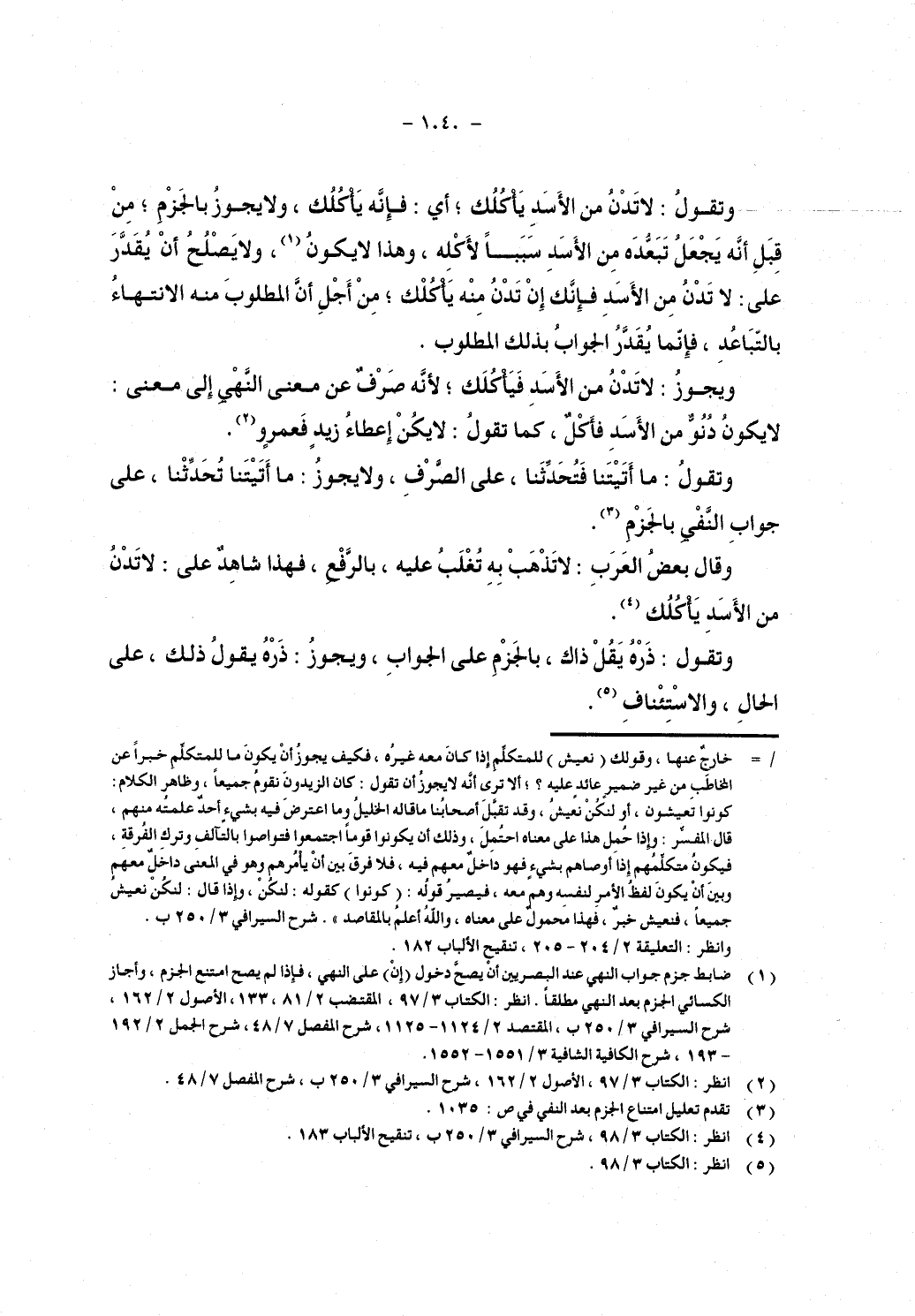 وتقول: لاتدن من الأسد يأكلك, أي: فإنه يأكلك, ولا يجوز بالجزم, من قبل أنه يجعل تبعده من الأسد سببًا لأكله, وهذا لا يكون ولا يصح أن يقدر على: لا تدن من الأسد فإنك إن تدن منه يأكلك, من أجل أن المطلوب منه الانتهاء بالتباعد, فإنما يقدر الجواب بذلك المطلوب.