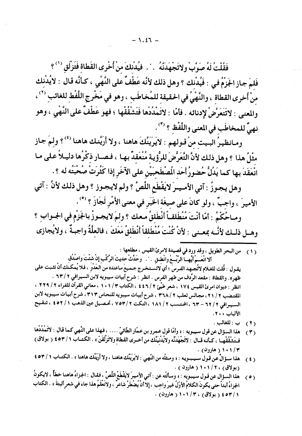 فلم جاز الجزم في: فيدنك؟ وهل ذلك لأنه عطف على النهي, كأنه قال: لا يدنك من أخرى القطاة, والنهي في الحقيقة للمخاطب, وهو في مخرج اللفظ للغائب, والمعنى: لا تتعرض لإدنائه. فأما: لا تمددها فتشققها, فهو عطف على النهي, وهو نهي للمخاطب في المعنى واللفظ؟