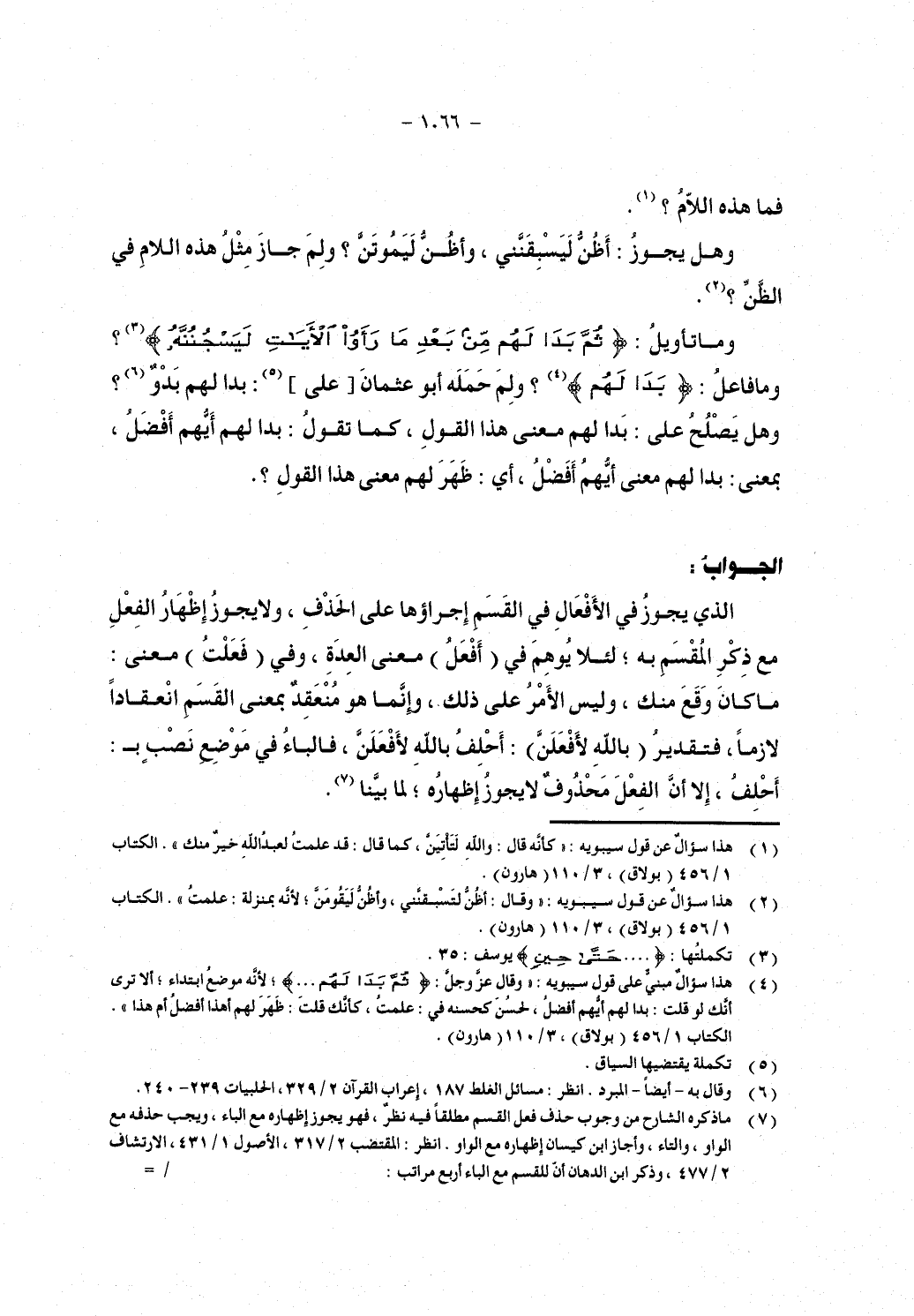 الذي يجوز في الأفعال في القسم إجراؤها على الحذف, ولا يجوز إظهار الفعل مع ذكر المقسم به, لئلا يوهم في (أفعل) معنى العدة, وفي (فعلت) معنى: ما كان وقع منك, وليس الأمر على ذلك, وإنما هو منعقد بمعنى القسم انعقادًا لازمًا, فتقدير (بالله لأفعلن): أحلف بالله لأفعلنو فالباء في موضع نصب بـ: أحلف, إلا أن الفعل محذوف لا يجوز إظهاره, لما بينا.