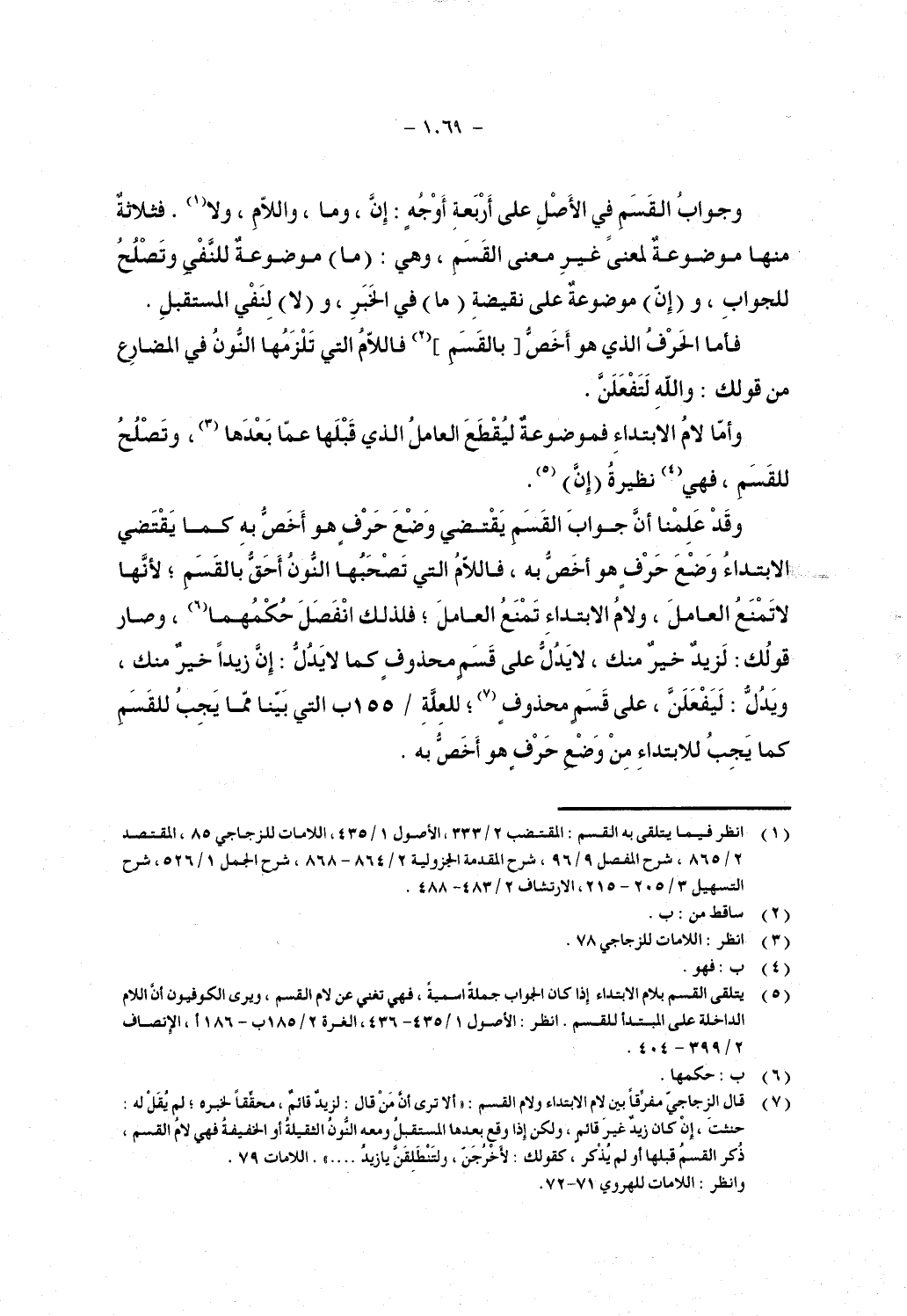 وقد علمنا أن جواب القسم يقتضي وضع حرف هو أخص به كما يقتضي الابتداء وضع حرف هو أخص به, فاللام التي تصحبها النون أحق بالقسم, لأنها لا تمنع العامل, ولام الابتداء تمنع العامل, فلذلك انفصل حكمهما, وصار قولك: لزيد خير منك, لا يدل على قسم محذوف كما لا يدل: إن زيدًا خير منك, ويدل: ليفعلن, على قسم محذوف, للعلة /155 ب التي بينا مما يجب للقسم كما يجب للابتداء من وضع حرف هو أخص به.
