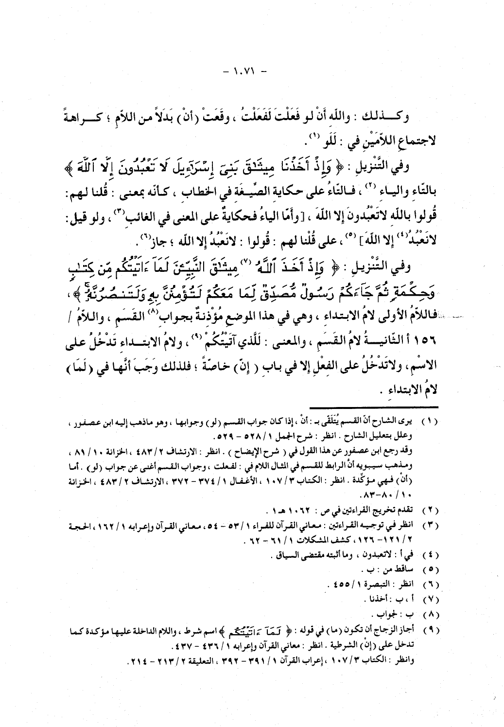 وفي التنزيل: {وَإِذْ أَخَذَ اللَّهُ مِيثَاقَ النَّبِيِّينَ لَمَا آتَيْتُكُمْ مِنْ كِتَابٍ وَحِكْمَةٍ ثُمَّ جَاءَكُمْ رَسُولٌ مُصَدِّقٌ لِمَا مَعَكُمْ لَتُؤْمِنُنَّ بِهِ وَلَتَنْصُرُنَّهُ} , فاللام الأولى لام الابتداء, وهي في هذا الموضع مؤذنة بجواب القسم, واللام / 156 أالثانية لام القسم, والمعنى: للذي آتيتكم, ولام الابتداء تدخل على الاسم, ولا تدخل على الفعل إلا في باب (إن) خاصة, فلذلك وجب أنها في (لما) لام الابتداء.