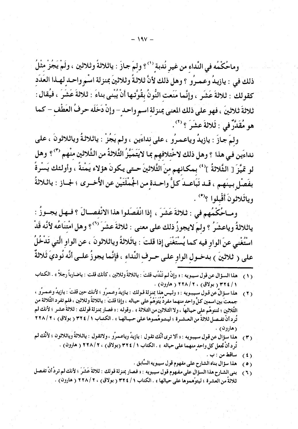 ولم جاز: يا زيد ويا عمرو، على نداءين، ولم يجز: يا ثلاثة ويا ثلاثون، على نداءين في ذلك لاختلافهم بما لا يتميز الثلاثة من الثلاثين منهم؟ وهل لو تميز [الثلاثة] بمكانهم من الثلاثين حتى يكون هؤلاء يمنة، وأولئك يسرة بفصل بينهم، قد تباعد كل واحدة من الجملتين عن الأخرى، لجاز: يا ثلاثة ويا ثلاثون أقبلوا.