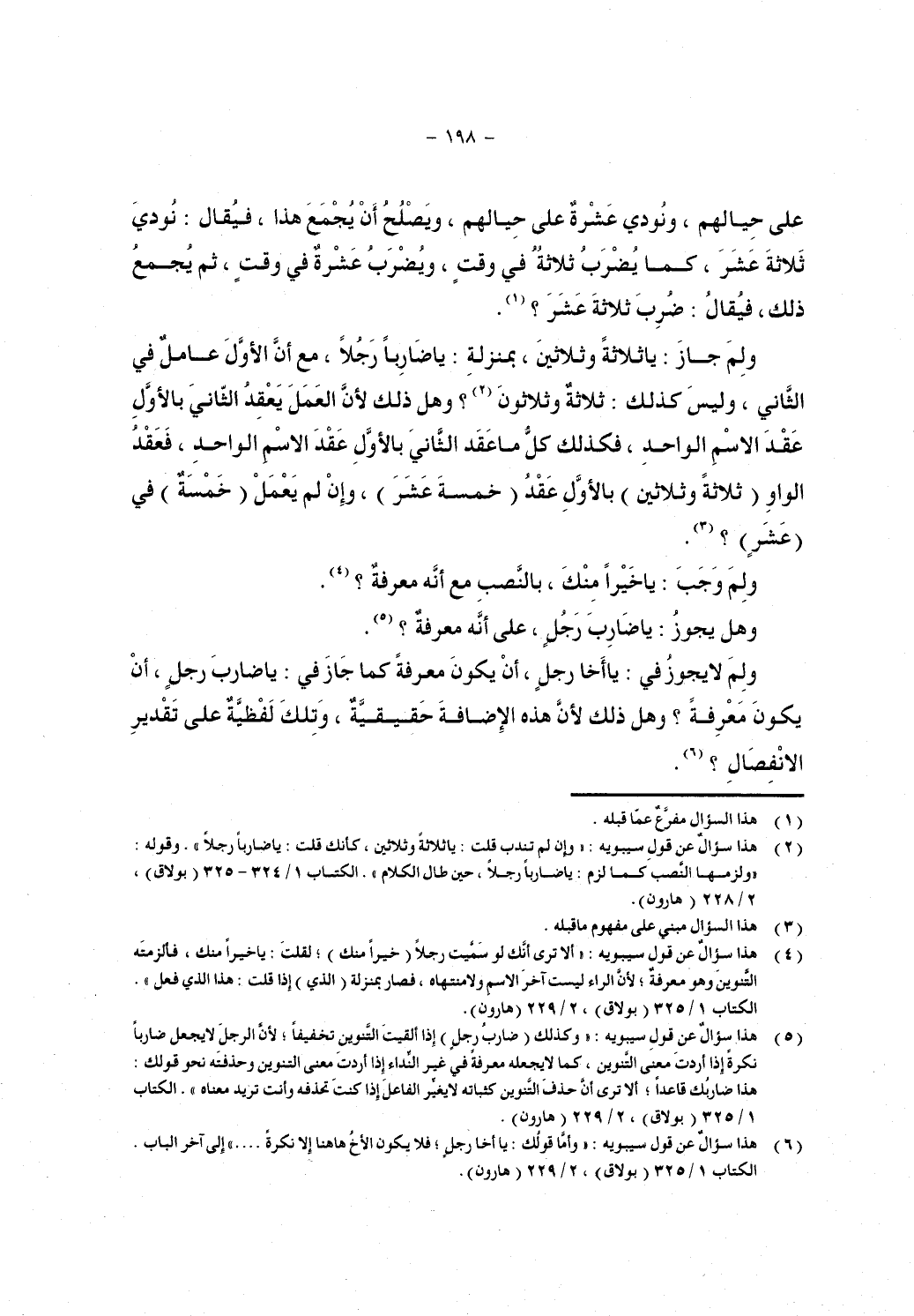 ولم جاز: يا ثلاثة وثلاثين، بمنزلة: يا ضاربا رجلا، مع أن الأول عامل في الثاني، وليس كذلك: ثلاثة وثلاثون؟ وهل ذلك لأن العمل يعقد الثاني بالأول عقد الاسم الواحد، فكذلك كل ما عقد الثاني بالأول عقد الاسم الواحد، فعقد الواو (ثلاثة وثلاثين) بالأول عقد (خمسة عشر) وإن لم يعمل (خمسة) في (عشر)؟