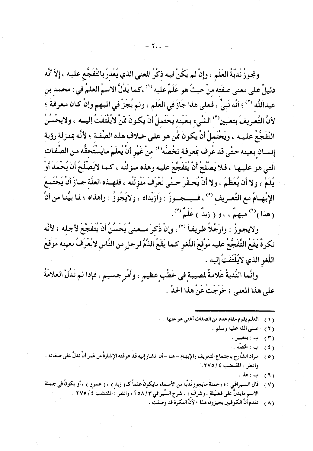 وتجوز ندبة العلم، وإن لم يكن فيه ذكر ال المعنى الذي يعذر بالتفجع عليه، إلا أنه دليل على معنى صفته من حيث هو علم عليه، كما يدل الاسم العلم في: محمد بن عبد الله؛ أنه نبي، فعلى هذا جاز في العلم، ولم يجز في المبهم وإن كان معرفة، لأن التعريف بتعيين الشيء بعينه يحتمل أن يكون مما لا لتفت إليه، ولا يحسن التفجع عليه، ويحتمل أن يكون ممن هو على خلاف هذه الصفة؛ لأنه بمنزلة رؤية إنسان بعينه حتى قد عرف بمعرفة تخصه من غير أن يعلم ما يستحقه من الصفات التي هو عليها، فلا يصلح أن يتفجع عليه وهذه منزلته، كما لا يصلح أن يحمد أو يذم، ولا أن يعظم، ولا أن يحقر حتى تعرف منزلته، فلهذه العلة جاز أن يجتمع الإبهام مع التعريف، فيجوز: وازيداه، ولا يجوز: واهذاه؛ لما بينا من أن (هذا) مبهم، و (زيد) علم.