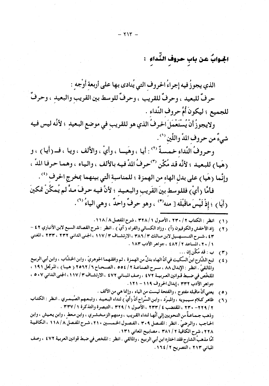 وحروف النداء خمسة: أيا، وهيا، وأي، والألف ويا، فـ (أيا) و (هيا) للبعيد؛ لأنه قد مكن حرف المد فيه بالألف، والياء، وهما حرفا المد، وإنما (هيا) على بدل الهاء من الهمزة؛ للمناسبة التي بينهما بمخرج الحرف.