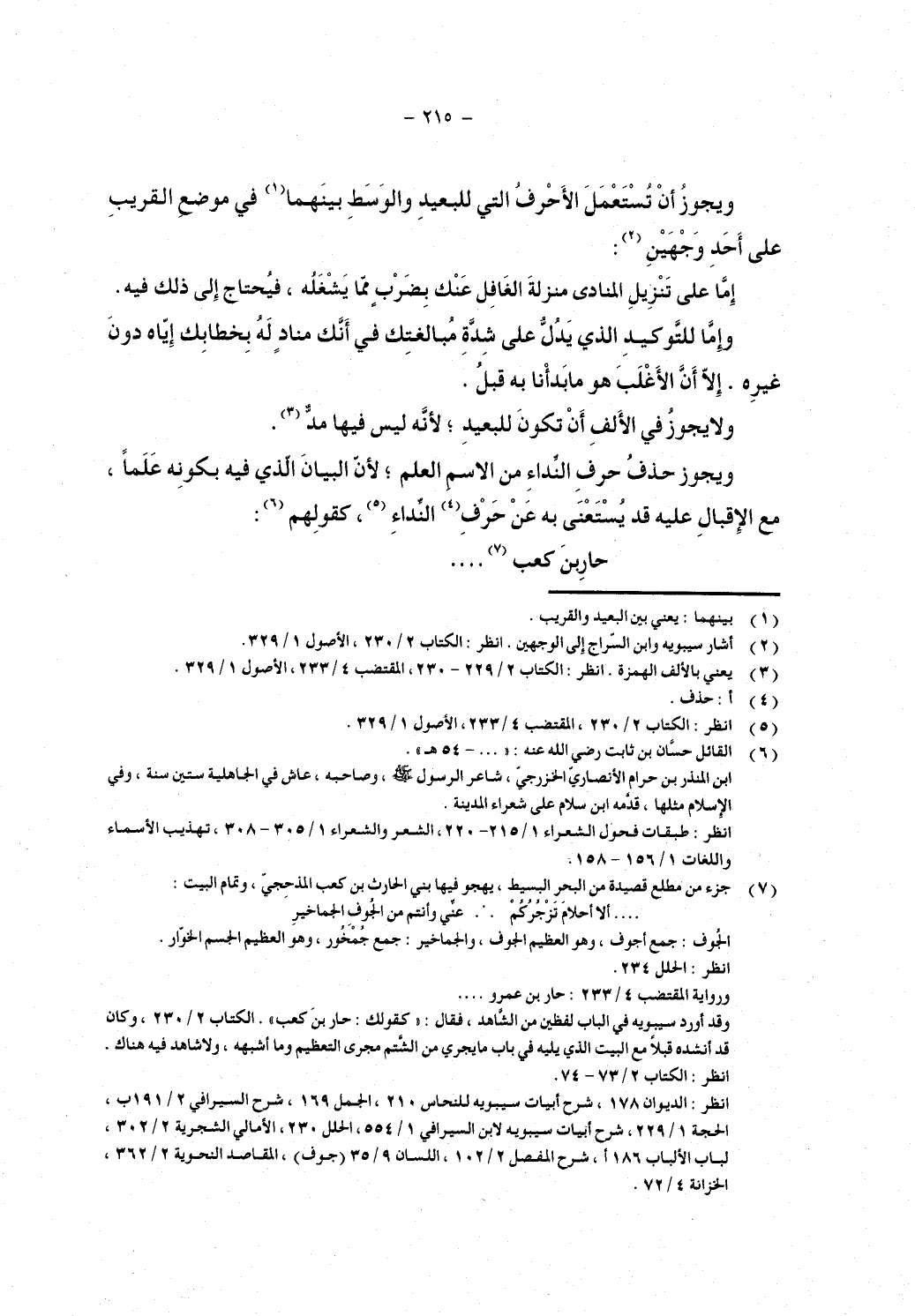 ويجوز حذف حرف النداء مع الاسم العلم؛ لأن البيان الذي فيه بكونه علماً، مع الإقبال عليه قد يستغنى به عن حرف النداء، كقولهم: