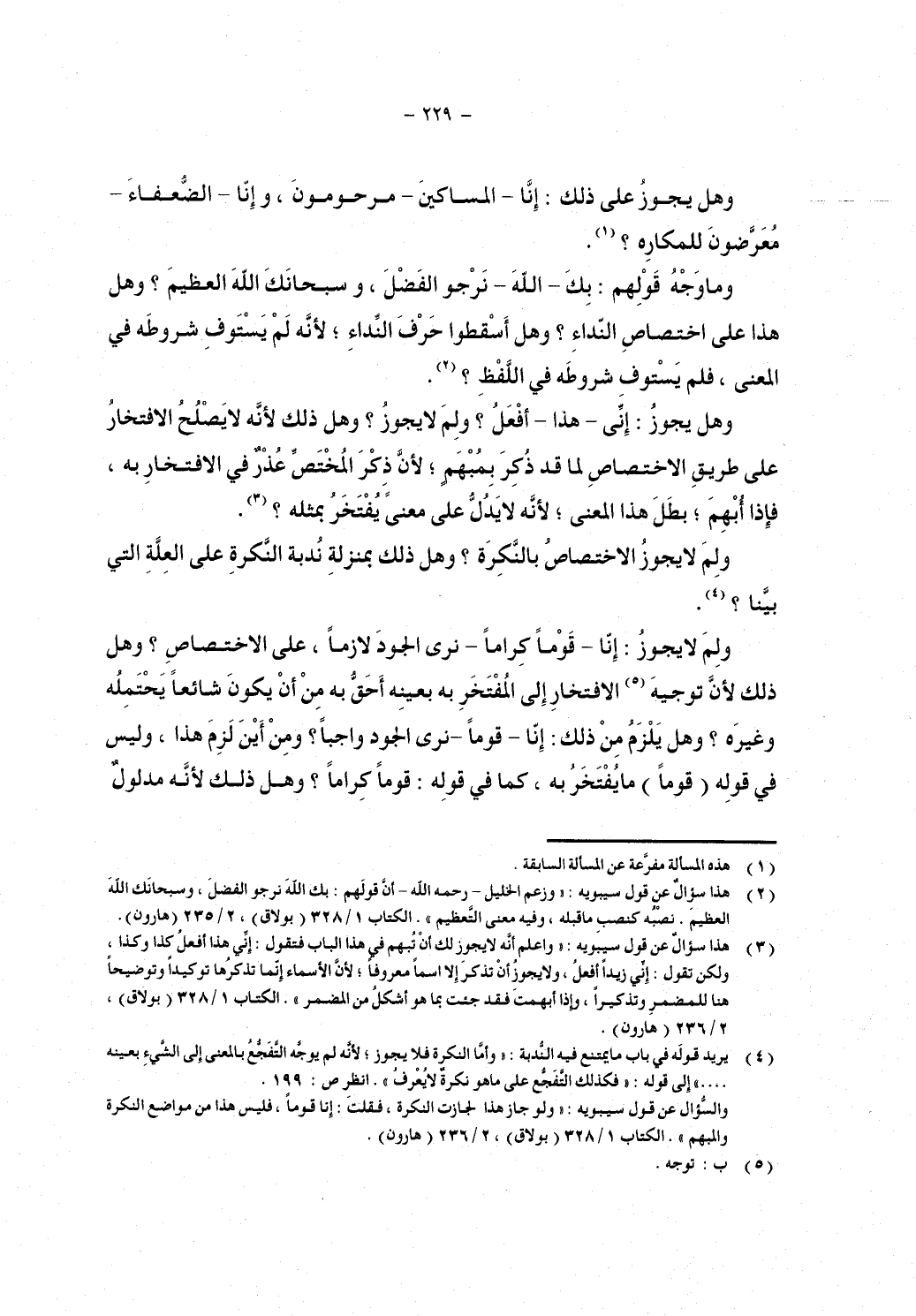 ولم لا يجوز: إنا- قوما كراما- نرى الجود لازما، على الاختصاص؟ وعل ذلك لأن توجيه الافتخار إلى المفتخر به بعينه أحق به من أن يكون شائعا يحتمله وغيره؟ وهل يلزم من ذلك: إنا- قوما- نرى الجود واجباً؟ ومن أين لزم هذا، وليس في قوله (قوماً) ما يفتخر به، كما في قوله: قوماً كراماً؟ وهل ذلك لأنه مدلول