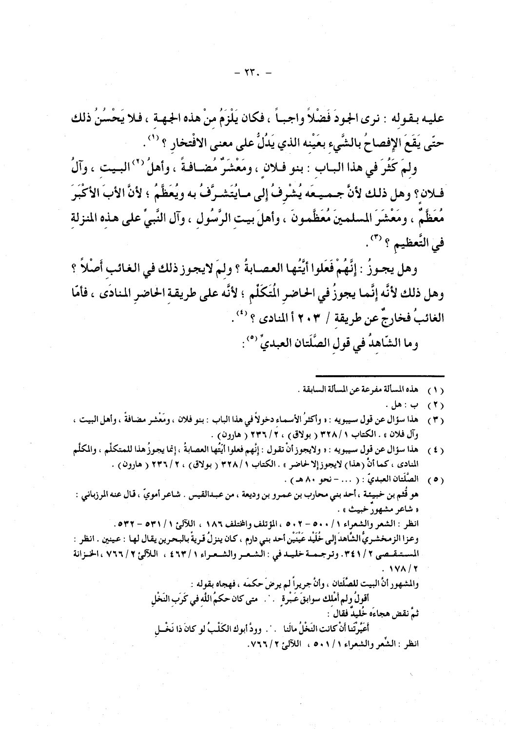 ولم كثر في هذا الباب: بنو فلان، ومعشر مضافة، وأهل البيت، وآل فلان؟ وهل ذلك لأن جميعه يشرف إلى ما يتشرف به ويعظم؛ لأن الأب الأكبر معظم، ومعشر المسلمين معظمون، وأهل بيت الرسول، وآل النبي على هذه المنزلة في التعظيم.