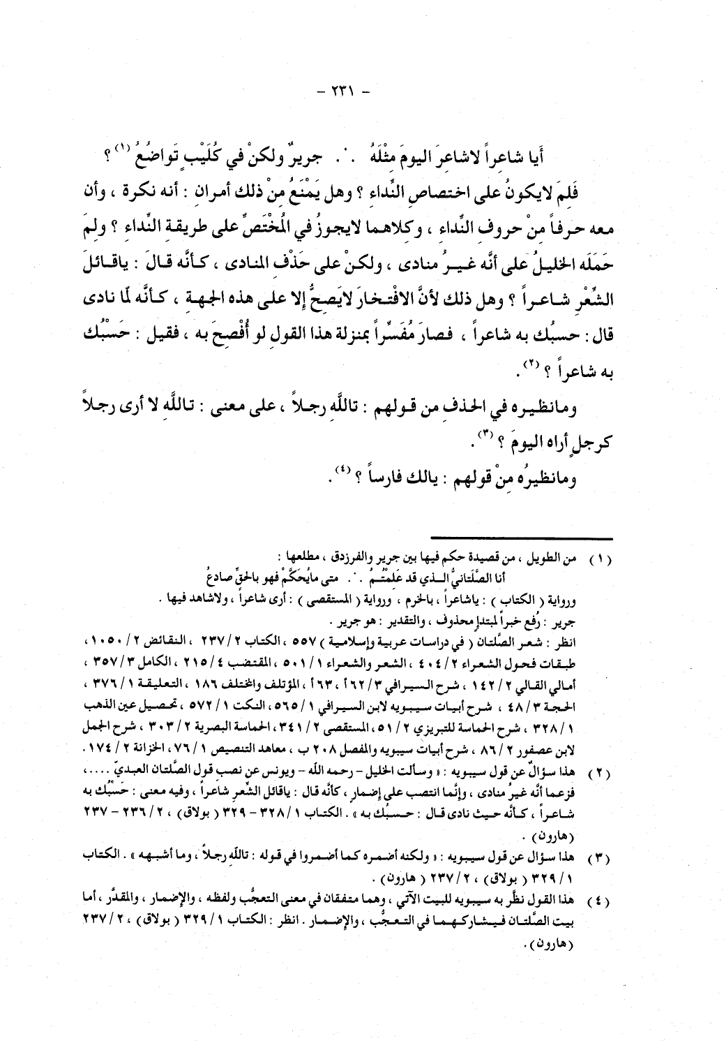 فلم لا يكون على اختصاص النداء؟ وهل يمنع من ذلك أمران: أنه نكره، وأن معه حرفا من حروف النداء، وكلاهما لا يجوز في المختص على طريقة النداء؟ ولم حمله الخليل على أنه غير منادي، ولكن على حذف المنادي، كأنه قال: يا قائل الشعر شاعراً؟ وهل ذلك لأن الافتخار لا يصح إلا على هذه الجهة، كأنه لما نادي قال: حسبك به شاعراً، فصار مفسراً بمنزلة هذا القول لو أفصح به، فقيل: حسبك به شاعرا.