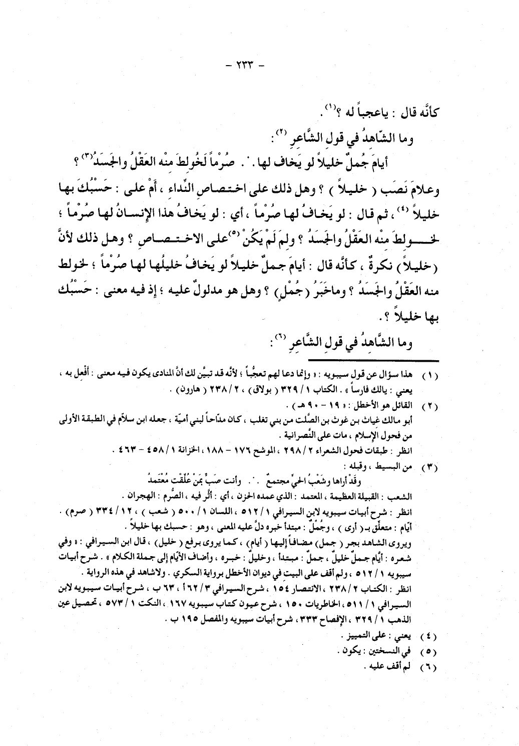 وعلام نصب (خليلاً)؟ وهل ذلك على اختصاص النداء، أم علي: حسبك بها خليلاً، ثم قال: لو يخاف لها صرماً، أي: لو يخاف هذا الإنسان لها صرماً؛ لخولط منه العقل والجسد؟ ولم لم يكن على الاختصاص؟ وهل ذلك (خليلا) نكرة، كأنه قال: أيام جمل خليلا لو يخاف خليلها لها صرماً؛ لخولط منه العقل والجسد؟ وما خير (جمل)؟ هل هو مدلول عليه؛ إذ فيه معنى: حسبك بها خليلاً؟