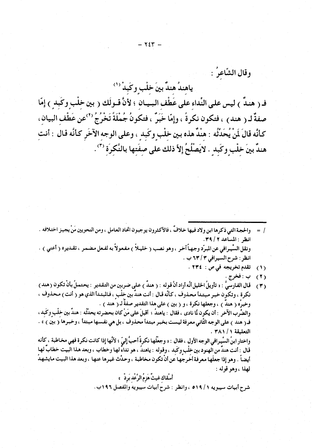 ) إما صفة لـ (هند) فتكون نكرة، وإما خبر، فتكون جملة تخرج عن عطف البيان، كأنه قال لمن يحدثه: هند هذه بين خلب وكبد، وعلى الوجه الآخر كأنه قال: أنت هند بين خلب وكبد. لا يصلح إلا ذلك على صفتها بالنكرة
