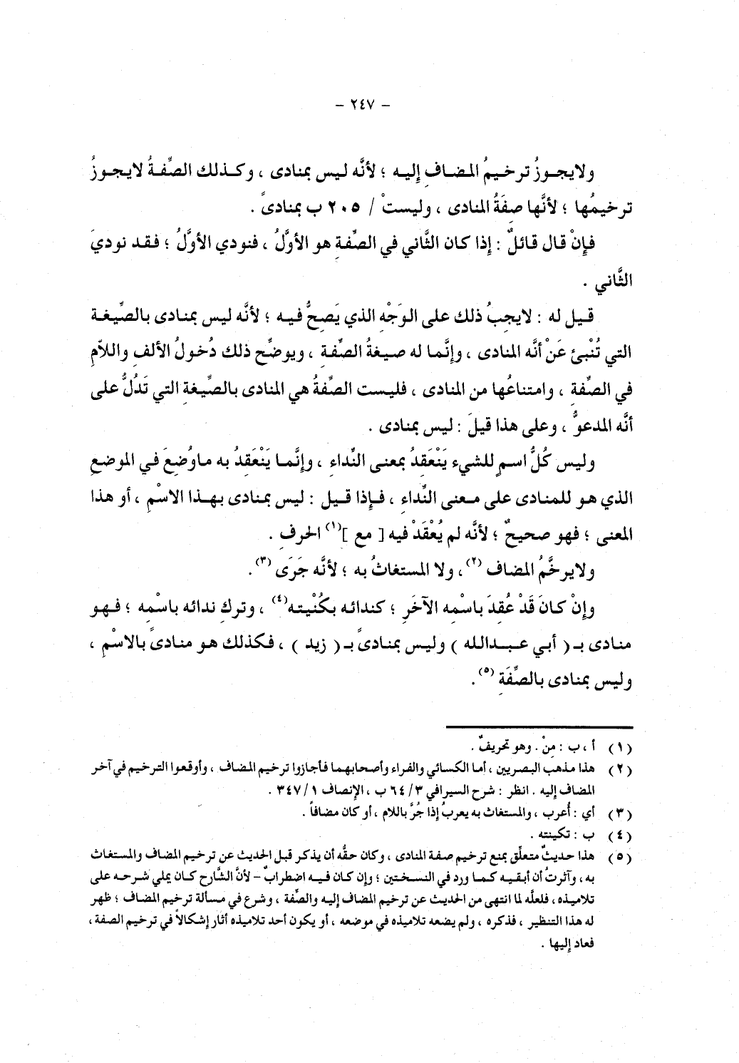ولا يجوز ترخيم المضاف إليه؛ لأنه ليس بمنادي، وكذلك الصفة لا يجوز ترخيمها؛ لأنها صفة المنادي، وليست/ 205 ب بمنادي.