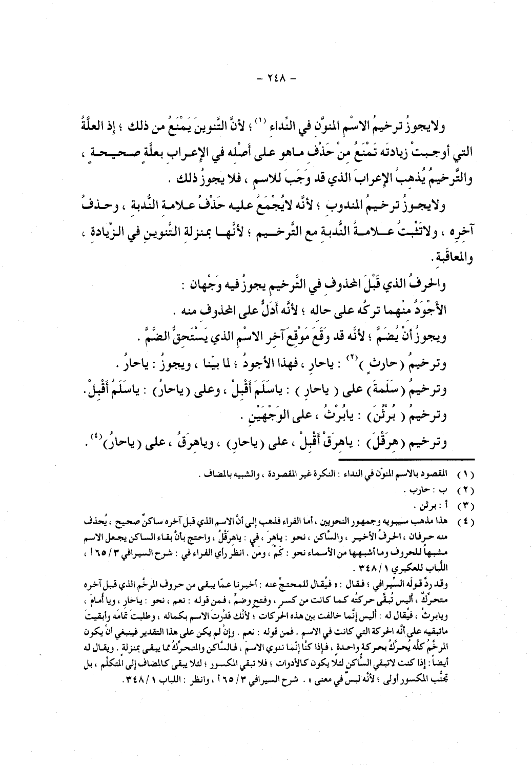 ولا يجوز ترخيم الاسم المنون في النداء؛ لأن التنوين يمنع من ذلك؛ إذ العلة التي أوجبت زيادته تمنع من حذف ما هو على أصله في الإعراب بعلة صحيحة، والترخيم يذهب الإعراب الذي قد وجب للاسم، فلا يجوز ذلك.