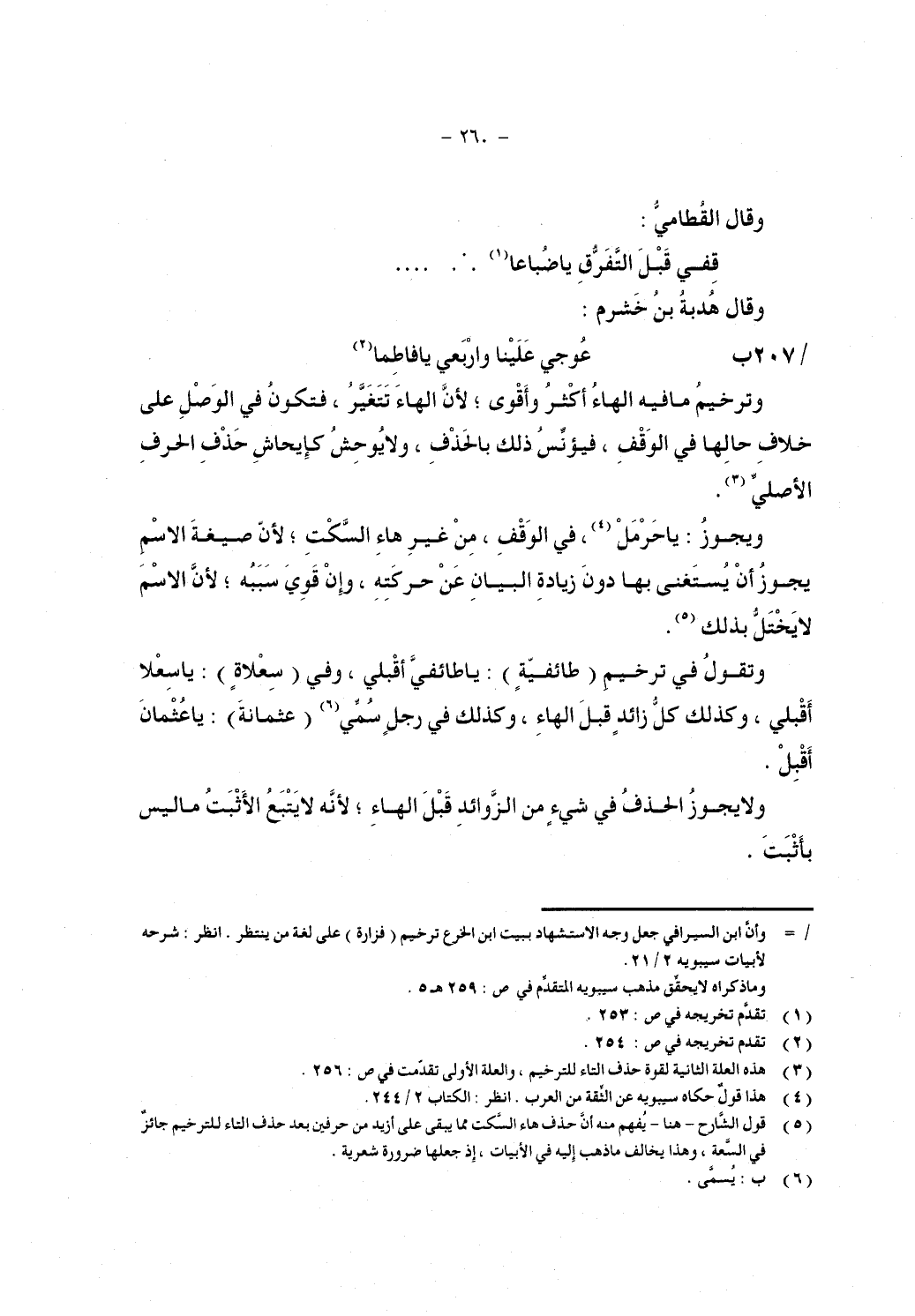 وتقول في ترخيم (طائفية): يا طائفي أقبلي، وفي (سعلاة) / يا سعلا أقبلي، وكذلك كل زائد قبل الهاء، وكذلك في رجل سمي، (عثمانة): يا عثمان أقبل.