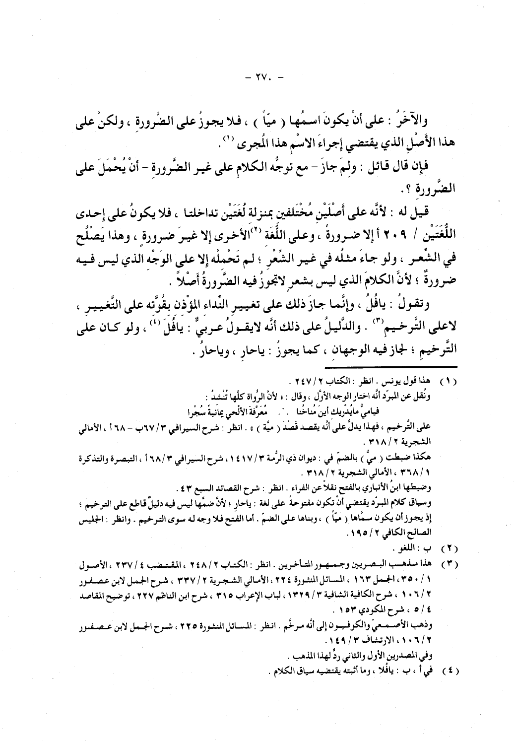 والآخر: على أن يكون اسمها (مياً) فلا يجوز على الضرورة، ولكن على هذا الأصل الذي يقتضي إجراء الاسم هذا المجرى.