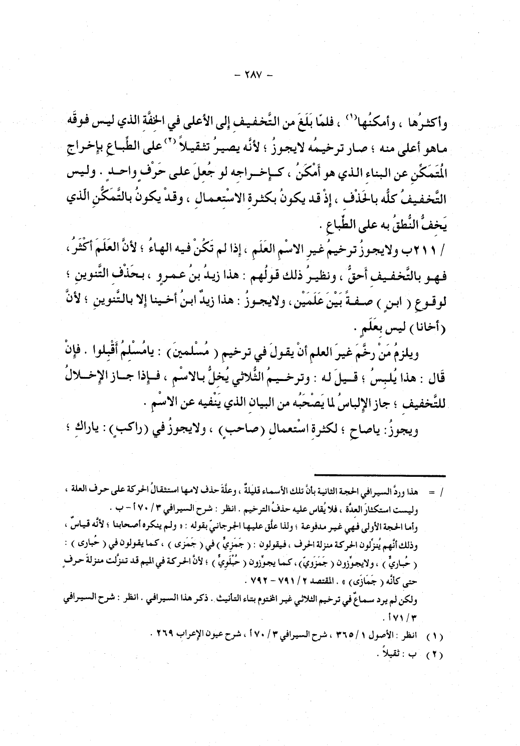 /211 ب ولا يجوز ترخيم غير الاسم العلم، إذا لم تكن فيه الهاء؛ لأن العلم أكثر، فهو بالتخفيف أحق، ونظير ذلك قولهم: هذا زيد بن عمرو، بحذف التنوين؛ لوقوع (ابن) صفة بين علمين، ولا يجوز: هذا زيد ابن أخينا إلا بالتنوين؛ لأن (أخانا) ليس بعلم.
