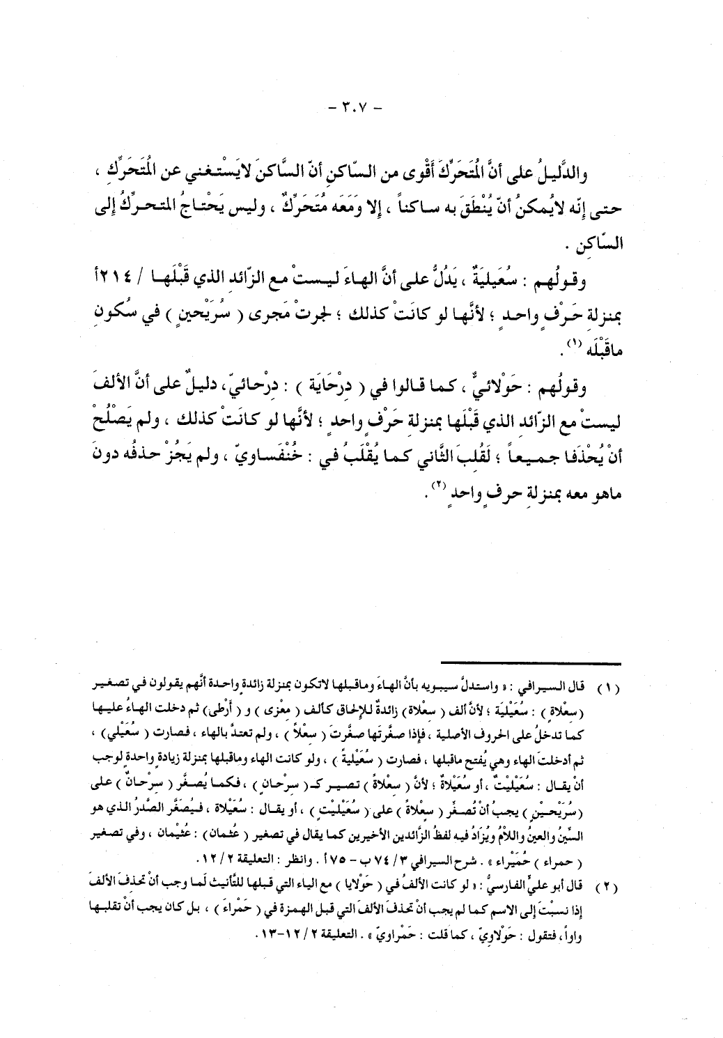 وقولهم: سعيلية، يدل على أن الهاء ليست مع الزائد الذي قبلها/214 أبمنزلة حرف واحد؛ لأنها لو كانت كذلك؛ لجرت مجرى (سريحين) في سكون ما قبله.