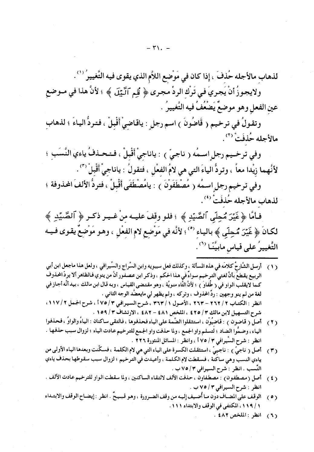 وتقول في ترخيم (قاضون) اسم رجل: يا قاضي أقبل، فترد الياء؛ لذهاب ما لأجله حذفت.