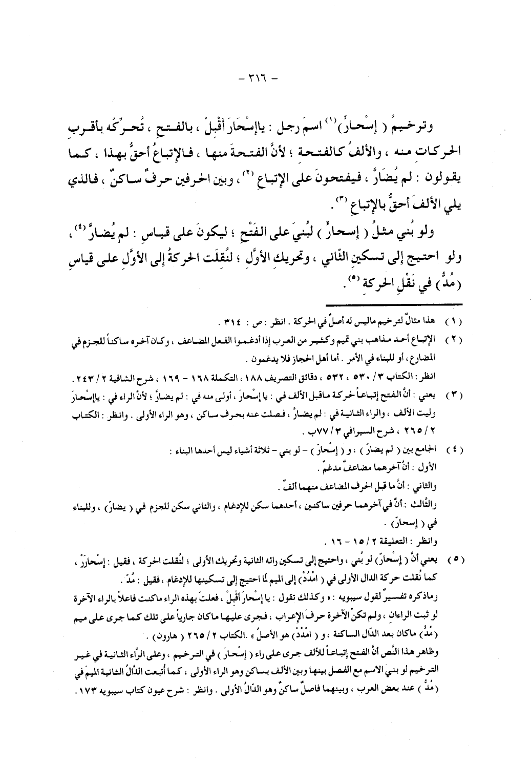 وترخيم (إسحار) اسم رجل: يا إسحار أقبل، بالفتح، تحركه بأقرب الحركات منه، والألف كالفتحة؛ لأن الفتحة منه، فالإتباع أحق بهذا، كما يقولون: لم يضار، فيفتحون على الإتباع، وبين الحرفين حرف ساكن، فالذي يلي الألف أحق بالإتباع.