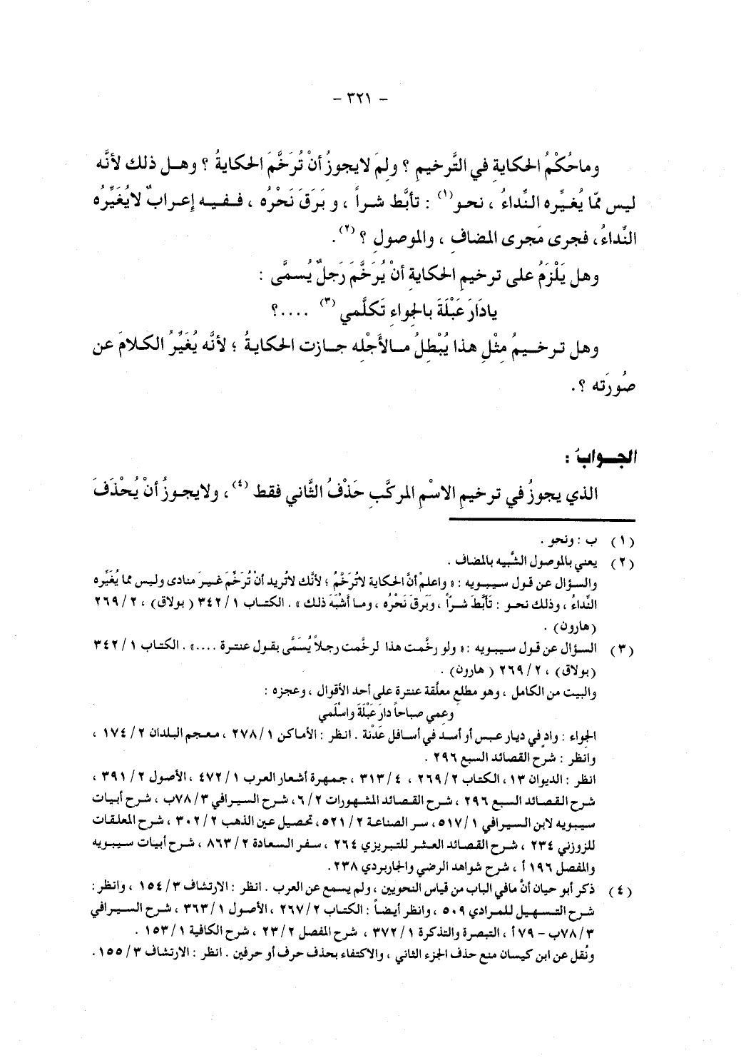وما حكم الحكاية في الترخيم؟ ولم لا يجوز أن يرخم الحكاية؟ هل ذلك لأنه ليس مما يغيره النداء، نحو: تأبط شراً، وبرق نحره، ففيه إعراب لا يغيره النداء، فجرى مجرى المضاف، والموصول؟