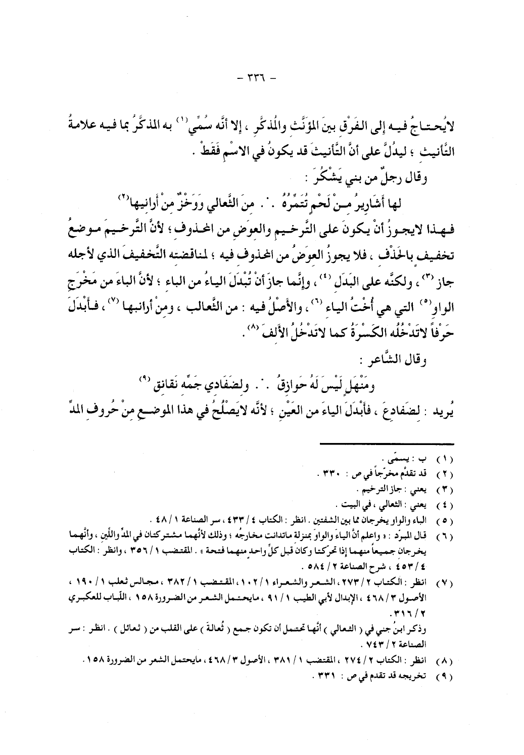 فهذا لا يجوز أن يكون على الترخيم والعوض من المحذوف؛ لأن الترخيم موضع تخفيف بالحذف، فلا يجوز العوض من المحذوف فيه؛ لمناقضته التخفيف الذي لأجله جاز ولكنه على البدل، وإنما جاز ان تبدل الياء من الباء؛ لأن الباء من مخرج الواو التي هي أخت الياء والأصل فيه: من الثعالب، ومن أرانبها فأبدل حرفا لا تدخله الكسرة كما لا تدخل الألف