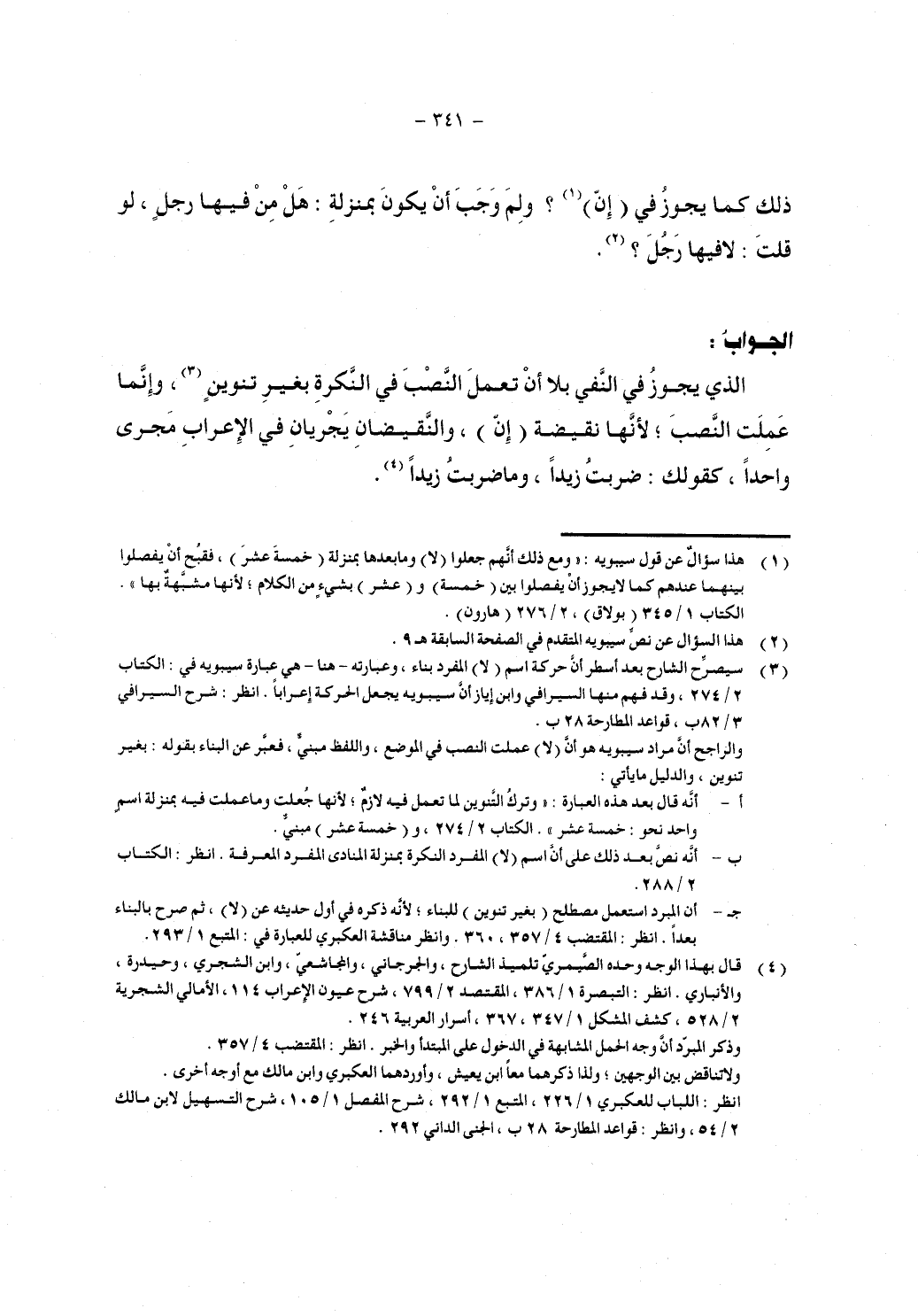 الجواب: الذي يجوز في النفس بلا أن تعمل النصب في النكرة بغير تنوين، وإنما عملت النصب؛ لأنها نقيضة (إن)، والنقيضان يجريان في الإهراب مجرى واحداً، كقولك ضربت زيداً، وما ضربت زيداً.