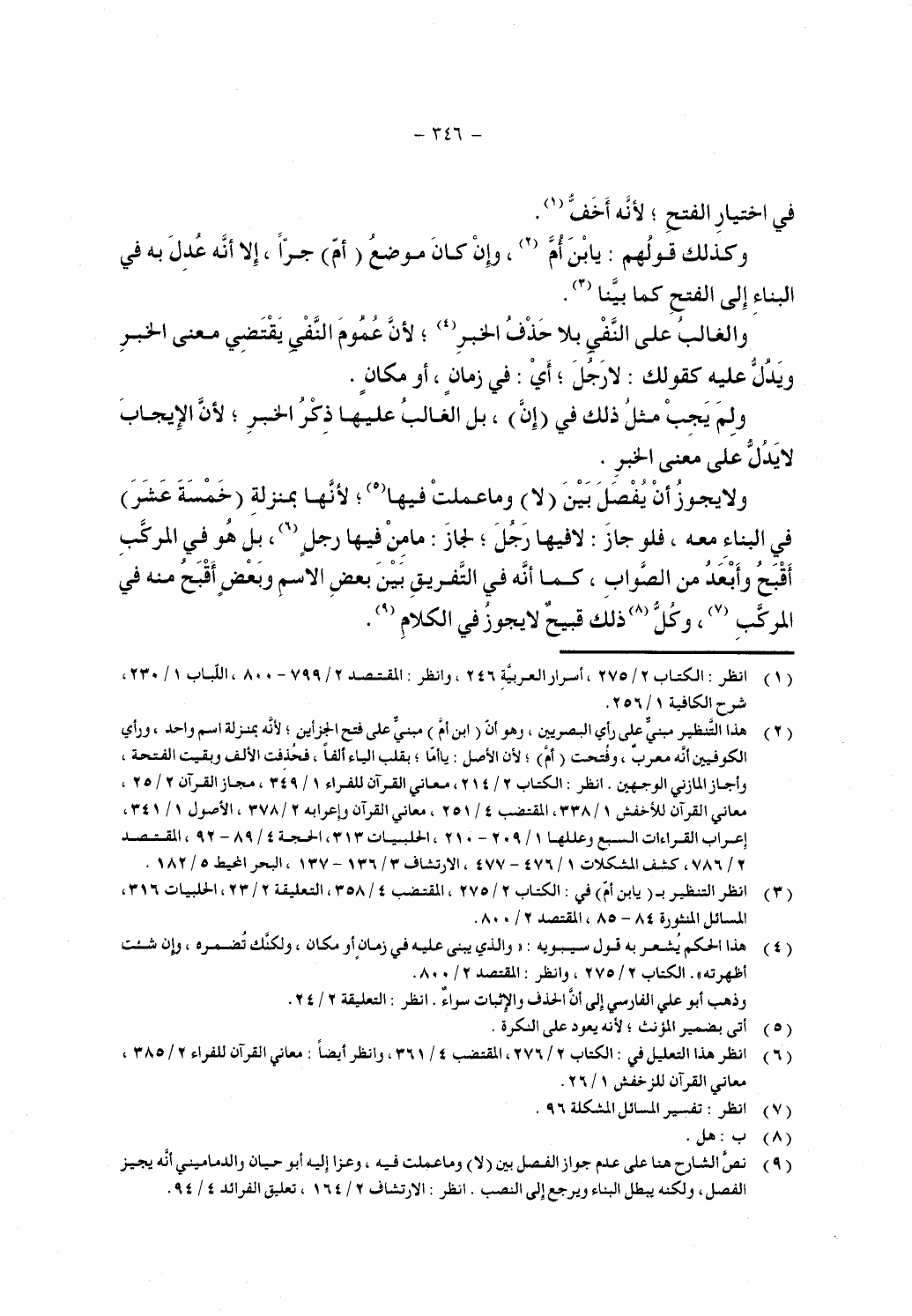 ولا يجوز أن يفصل بين (لا) وما عملت فيها؛ لأنها بمنزلة (خمسة عشر) في البناء معه، فلو جاز: لا فيها رجل؛ لجاز: ما من فيها رجل بل هو في المركب أقبح وأبعد من الصواب، كما أنه في التفريق بين بعض الاسم وبعض أقبح منه في المركب، وكل ذلك قبيح لا يجوز في الكلام.