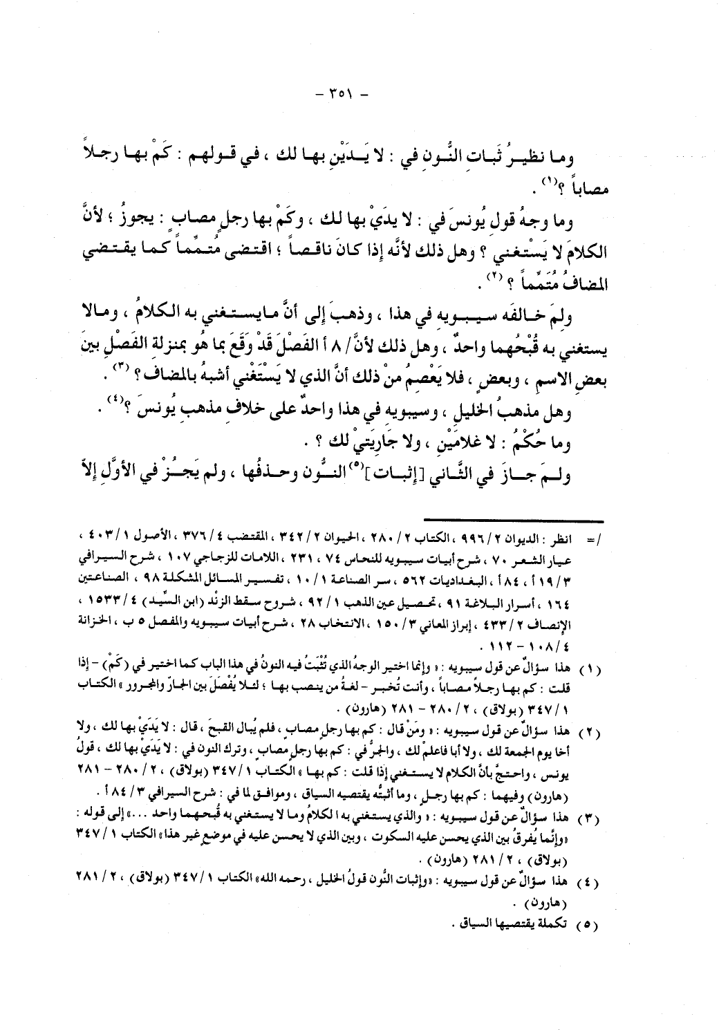 وما وجه قول يونس في: لا يدي بها لك، وكم بها رجل مصاب: يجوز؛ لأن الكلام لا يستغني؟ وهل ذلك لأنه إذا كان ناقصاً؛ اقتضى متمم كما يقتضي المضاف متمماً؟