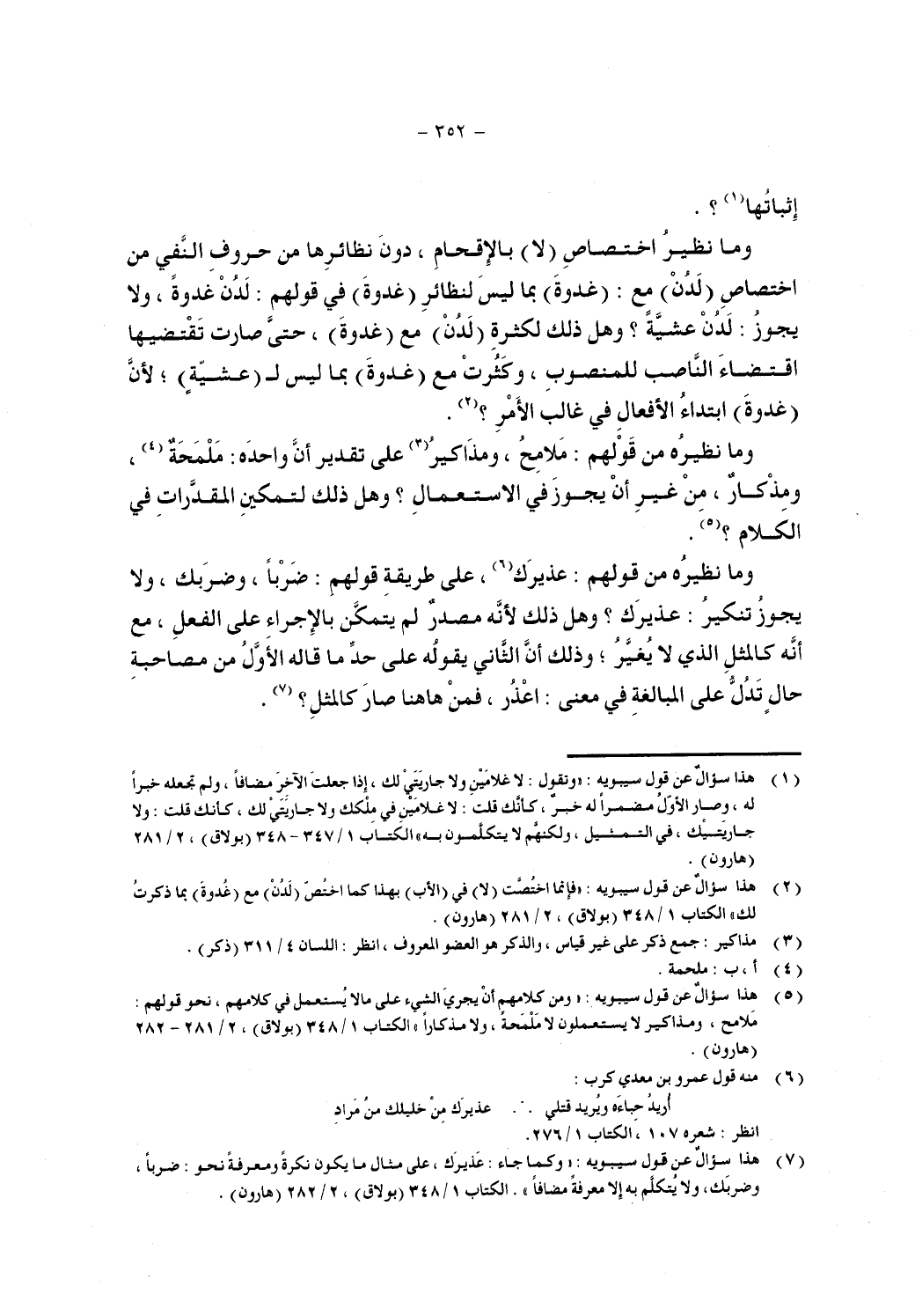 وما نظير اختصاص (لا) بالإقحام، دون نظائرها من حروف النفي من اختصاص (لدن) مع: (غدوة) بما ليس لنظائره (غدوة) في قولهم: لدن غدوة، ولا يجوز: لدن عشية؟ وهل ذلك لكثرة (لدن) مع غدوة حتى صارت تقتضيها اقتضاء الناصب للمنصوب، وكثرت مع (غدوة) بما ليس لـ (عشية)؛ لأن (غدوة) ابتداء الأفعال في غالب الأمر.