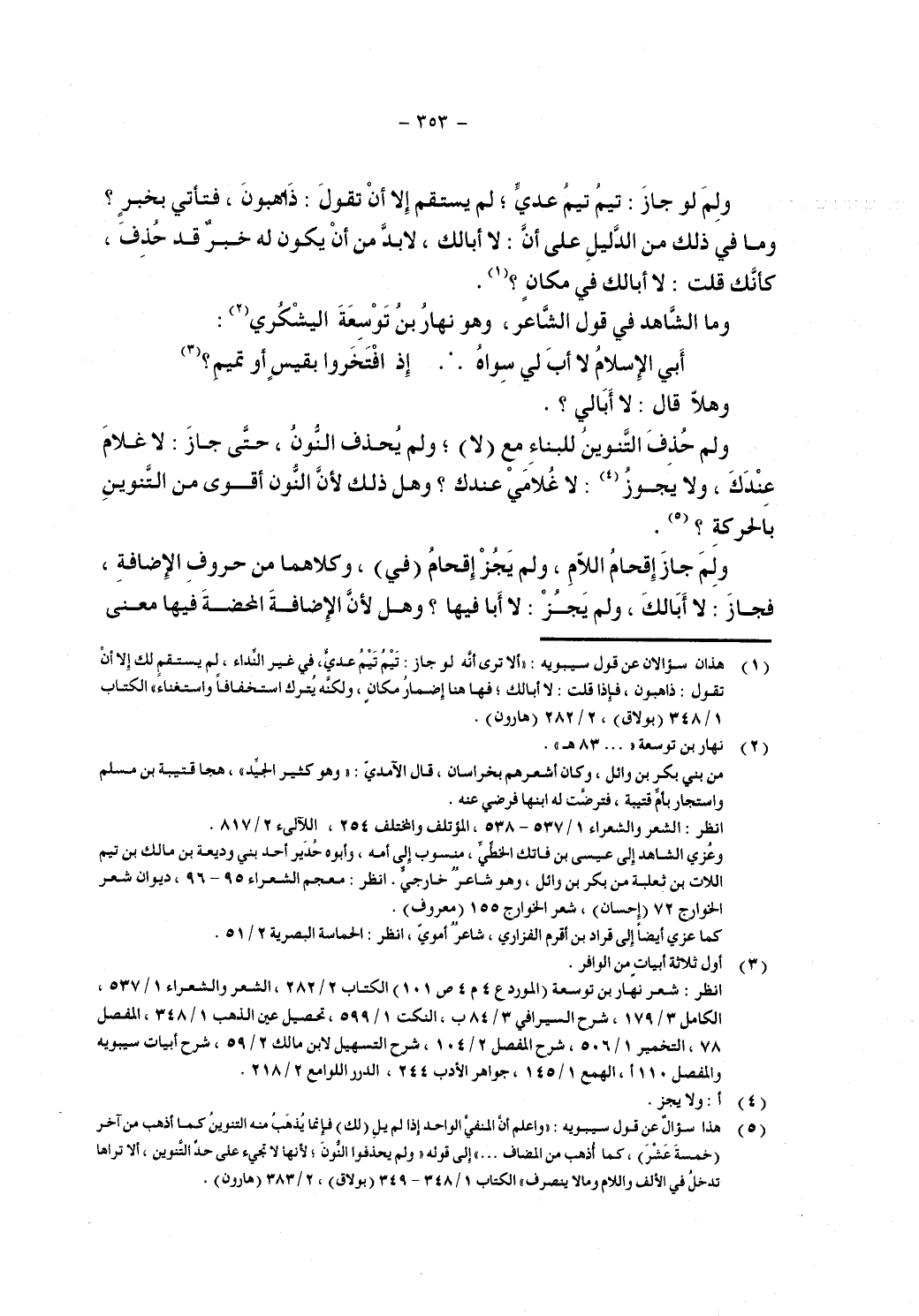 ولم حذف التنوين للبناء مع (لا)؛ ولم يحذف النون حتى جاز: لا غلام عندك، ولا يجوز: لا غلامي عندك؟ وهل ذلك لأن النون أقوى من التنوين بالحركة؟