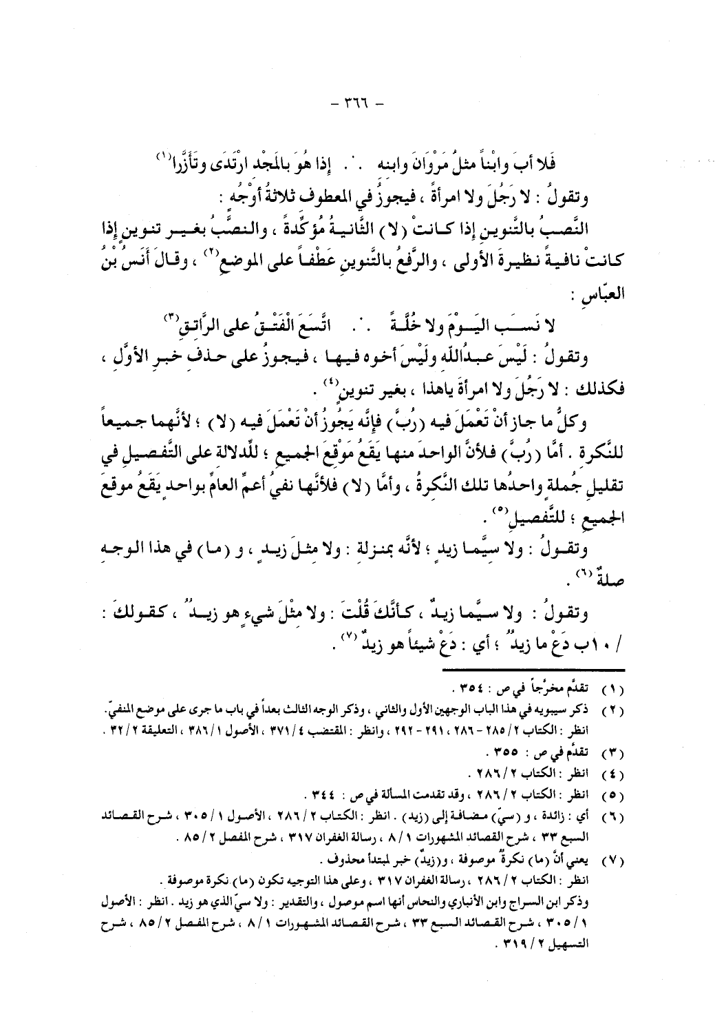 وكل ما جاز أن تعمل فيه (رب) فإنه يجوز أن تعمل فيه (لا)؛ لأنهما جميعا للنكرة. أما (رب) فلأن الواحد منها يقع موقع الجميع؛ للدلالة على التفصيل في تقليل جملة واحدة النكرة، وأما (لا) فلأنها نفي أعم العام بواحد يقع موقع الجميع؛ للتفصيل.