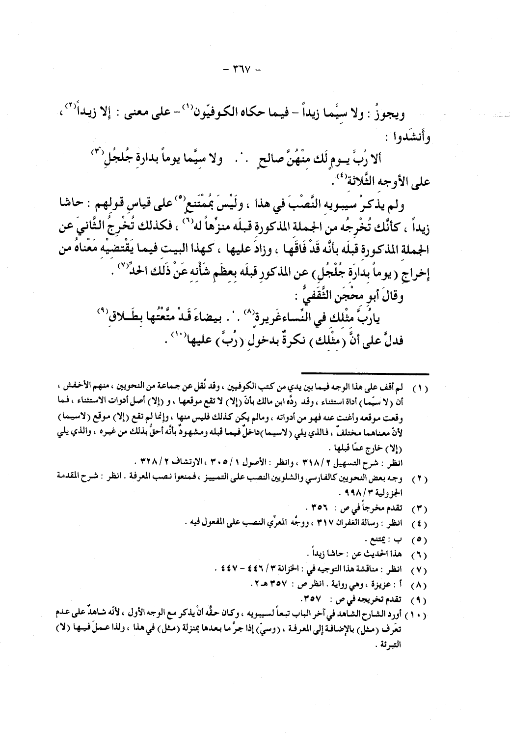 ولم يذكر سيبويه النصب في هذا، وليس بممتنع على قياس فولهم: حاشا زيدا، كأنك تخرجه من الجملة المذكورة قبله منزها له، فكذلك تخرج الثاني عن الجملة المذكورة قبله بأنه قد فاقها، وزاد عليها، كهذا البيت فيما يقتضيه معناه من إخراج (يوما بدارة جلجل) عن المذكور قبله بعظم شأنه عن ذلك الحد.