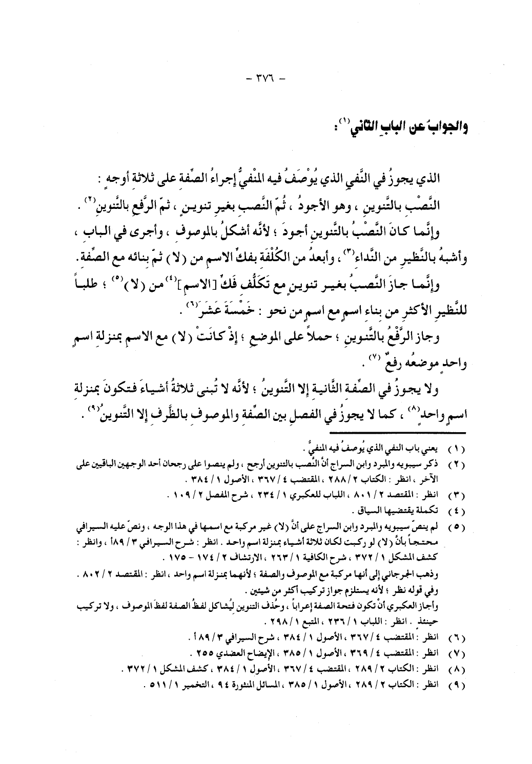 ولا يجوز في الصفة الثانية إلا بالتنوين؛ لأنه لا تبنى ثلاثة أشياء فتكون بمنزلة اسم واحد، كما لا يجوز في الفصل بين الصفة والموصوف بالظرف إلا التنوين.