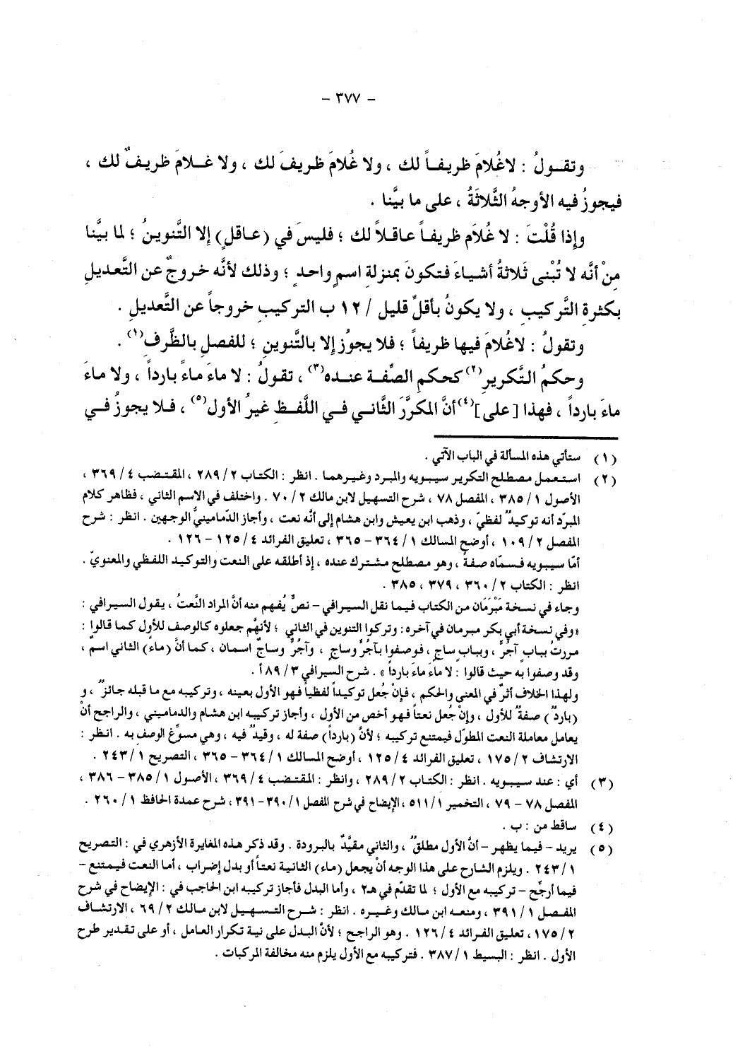 وإذا قلت: لا غلام ظريفا عاقلا لك؛ فليس في (عاقل) إلا التنوين؛ لما بينا من أنه لا تبنى ثلاثة أشياء فتكون بمنزلة اسم واحد؛ وذلك لأنه خروج عن التعديل بكثرة التركيب، ولا يكون بأقل قليل التركيب خروجا عن التعديل.