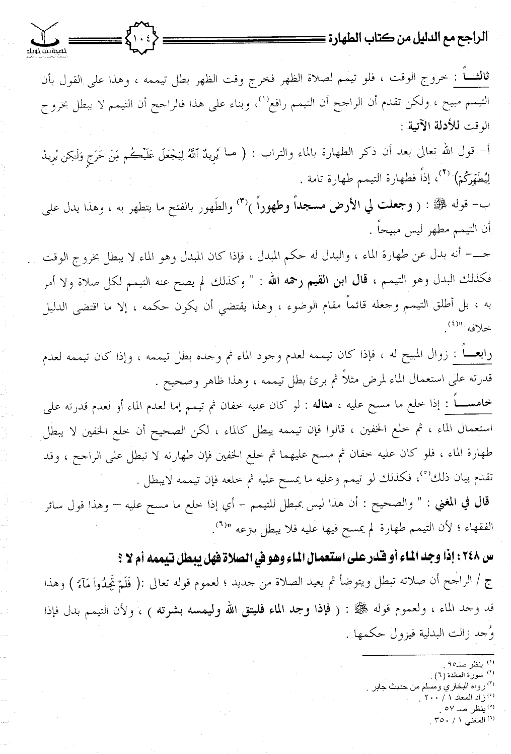 ج- أنه بدل عن طهارة الماء, والبدل له حكم المبدل, فإذا كان المبدل وهو الماء لا يبطل بخروج الوقت فكذلك البدل وهو التيمم, وقال ابن القيم رحمه الله: (وكذلك لم يصح عنه التيمم لكل صلاة ولا أمر به, بل أطلق التيمم وجعله قائماً مقام الوضوء, وهذا يقتضي أن يكون حكمه, إلا ما اقتضى الدليل خلافه) (¬4).