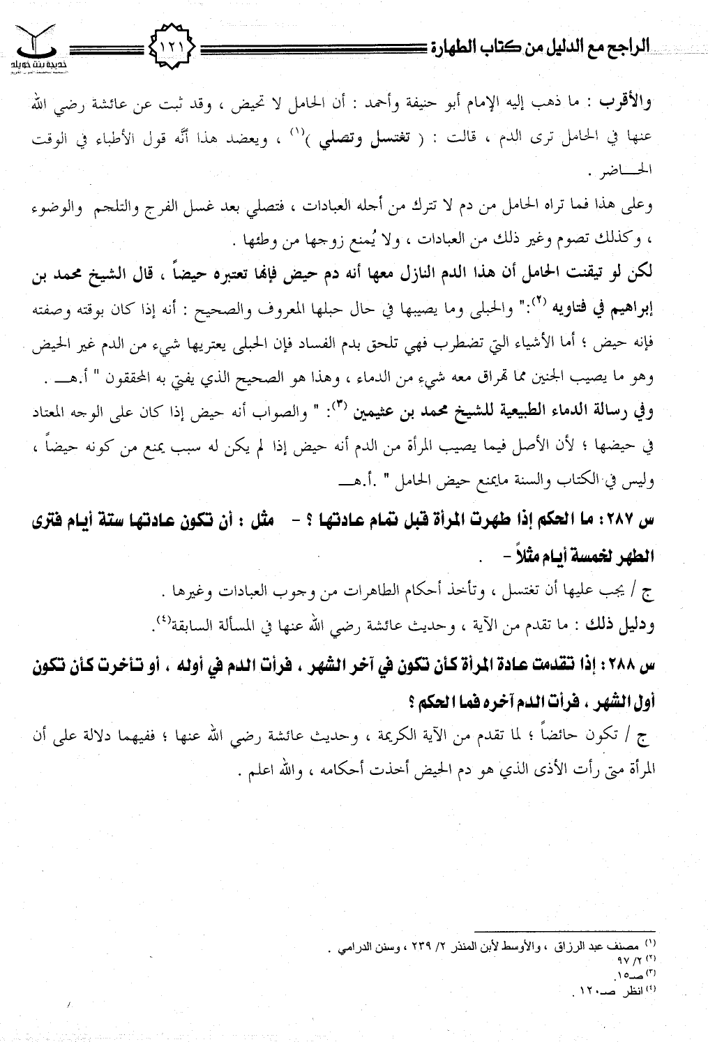 وفي رسالة الدماء الطبيعية للشيخ محمد بن عثيمين (¬3): (والصواب أنه حيض إذا كان على وجه المعتاد في حيضها, لأن الأصل فيما يصيب المرأة من الدم أنه حيض إذا لم يكن له سبب يمنع من كونه حيضاً, وليس في الكتاب والسنة ما يمنع حيض الحامل) أ. هـ.