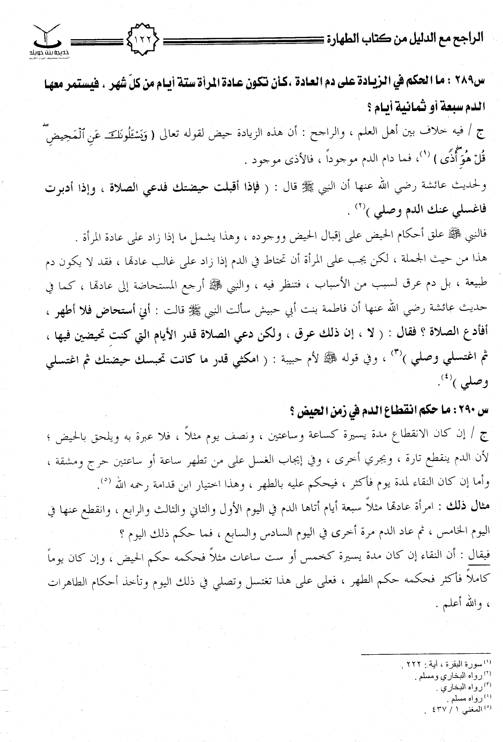 س289: ما الحكم في الزيادة على دم العادة, كأن تكون عادة المرأة ستة أيام من كلّ شهر, فيستمر معها الدم سبعة أو ثمانية أيام؟
