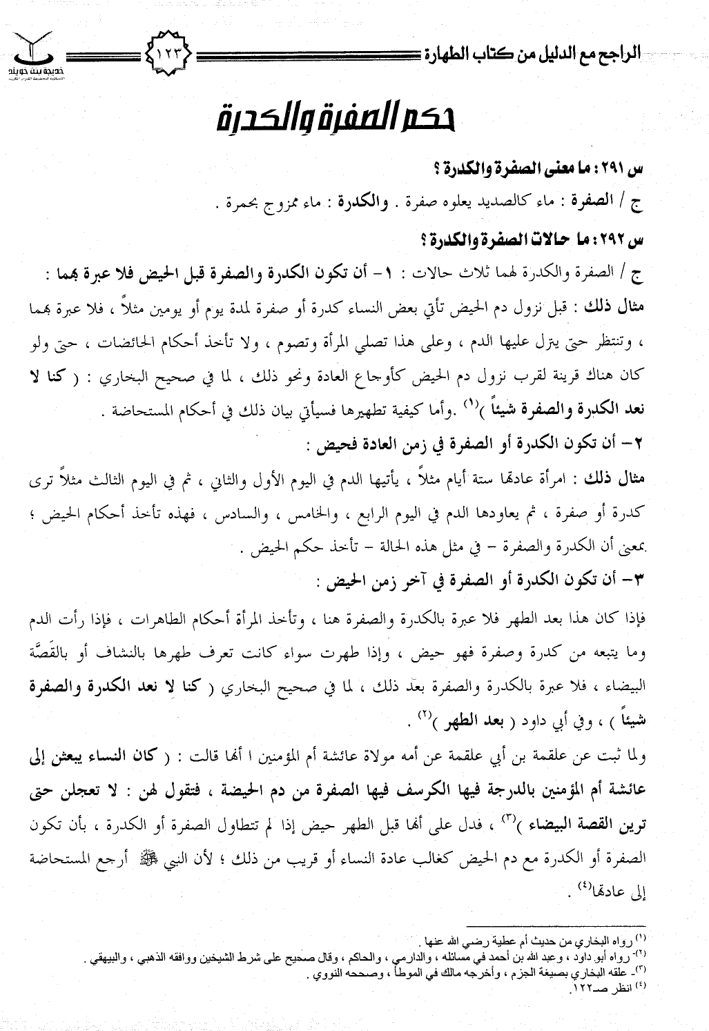 فإذا كان هذا بعد الطهر فلا عبرة بالكدرة والصفرة هنا, وتأخذ المرأة أحكام الطاهرات, فإذا رأت الدم وما يتبعه من كدرة وصفرة فهو حيض, وإذا طهرت سواء كانت تعرف طهرها بالنشاف أو بالقَصَّة البيضاء, فلا عبرة بالكدرة والصفرة بعد ذلك, لما في صحيح البخاري - كنا لا نعد الكدرة والصفرة شيئاً - , وفي أبي داود - بعد الطهر (¬2) -.