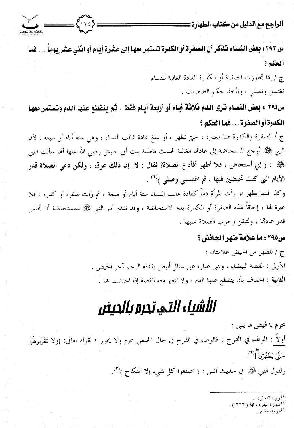 س294: بعض النساء ترى الدم ثلاثة أيام أو أربعة أيام فقط, ثم ينقطع عنها الدم وتستمر معها الكدرة أو الصفرة, فما الحكم؟