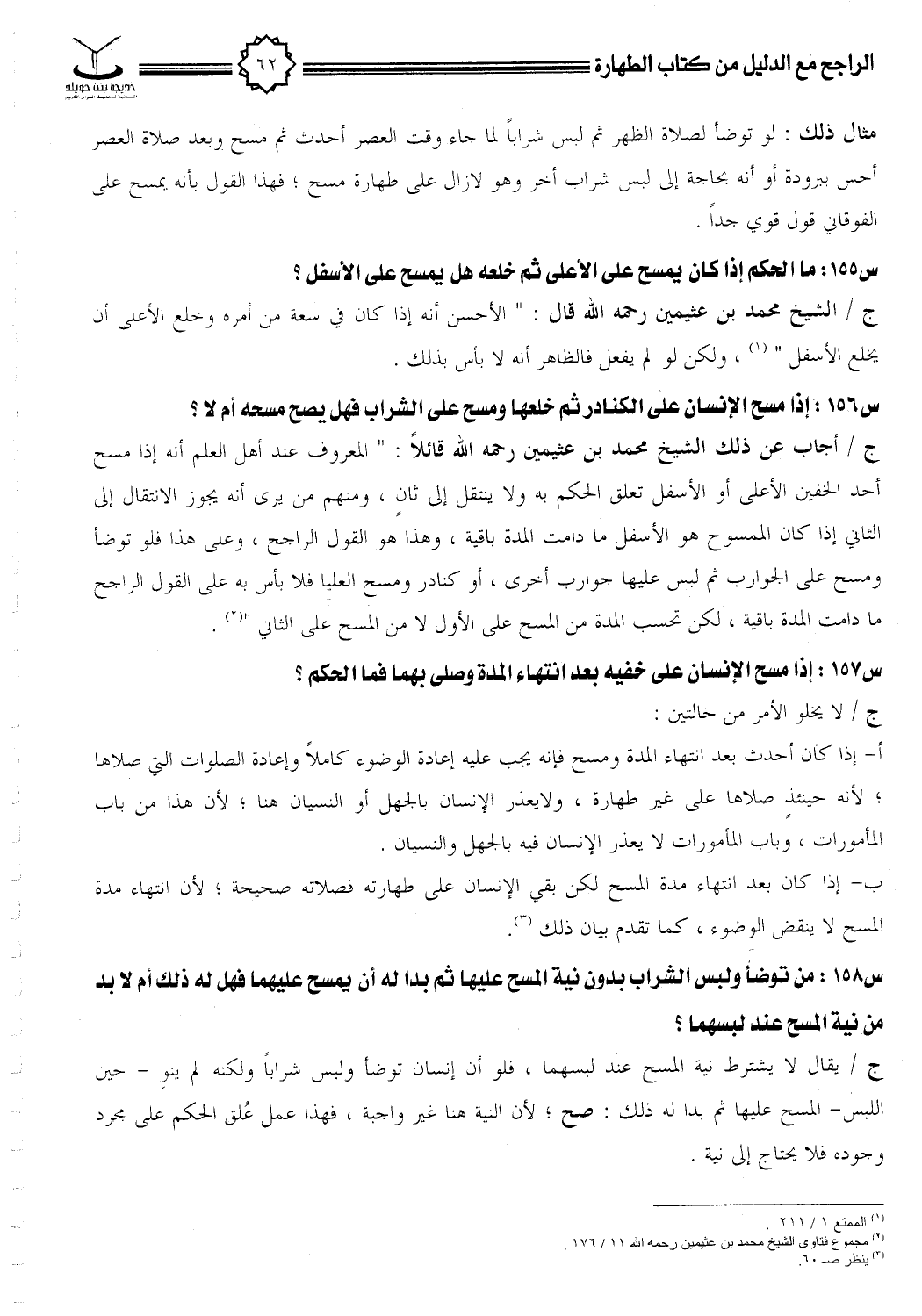 ج/ أجاب عن ذلك الشيخ محمد بن عثيمين رحمه الله قائلاً (المعروف عند أهل العلم أنه إذا مسح أحد الخفين الأعلى أو الأسفل تعلق الحكم به إلى ثانٍ, ومنهم من يرى أنه يجوز الانتقال إلى الثاني إذا كان الممسوح هو الأسفل ما دامت المدة باقية, وهذا هو القول الراجح, وعلى هذا فلو توضأ ومسح على الجوارب ثم لبس عليها جوارب أخرى, أو كنادر ومسج العليا فلا بأس به على القول الراجح ما دامت المدة باقية, لكن تحتسب المدة من المسح على الأول لا من المسح على الثاني) (¬2).