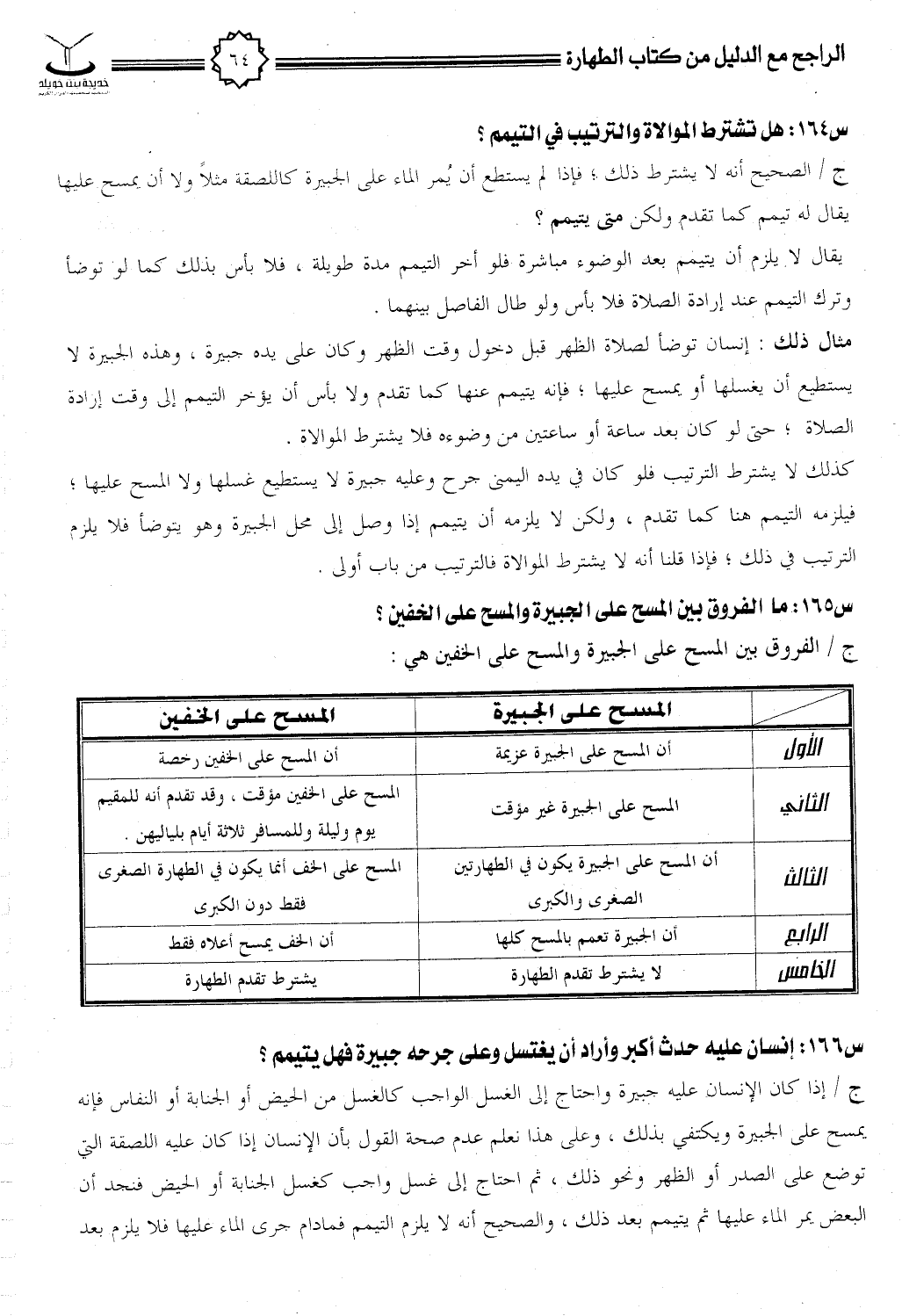 س164: هل تشترط الموالاة والترتيب في التيمم؟