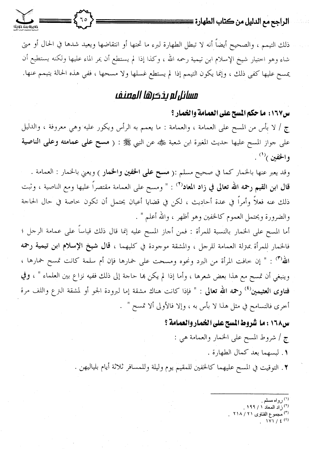 أما المسح على الخمار بالنسبة للمرأة فمن أجاز المسح عليه إنما قال ذلك قياساً على عمامة الرجل, فالخمار للمرأة بمنزلة العمامة للرجل, والمشقة موجودة في كليهما, قال شيخ الإسلام ابن تيمية رحمه الله (¬3) (إن خافت المرأة من البرد ونحوه ومسحت على خمارها فإن أم سلمة كانت تمسح خمارها, وينبغي أن تمسح مع هـ1ابعض شعرها, وأما إذا لم يكن بها حاجة إلى ذلك ففيه نزاع بين العلماء, وفي فتاوى العثيمين (¬4) رحمه الله تعالى (فإذا كانت هناك مشقة إما لبرودة الجو أو لمشقة النزع واللف مرة أخرى فالتسامح في مثل هذا لا بأس به, وإلا فالأولى ألا تمسح).