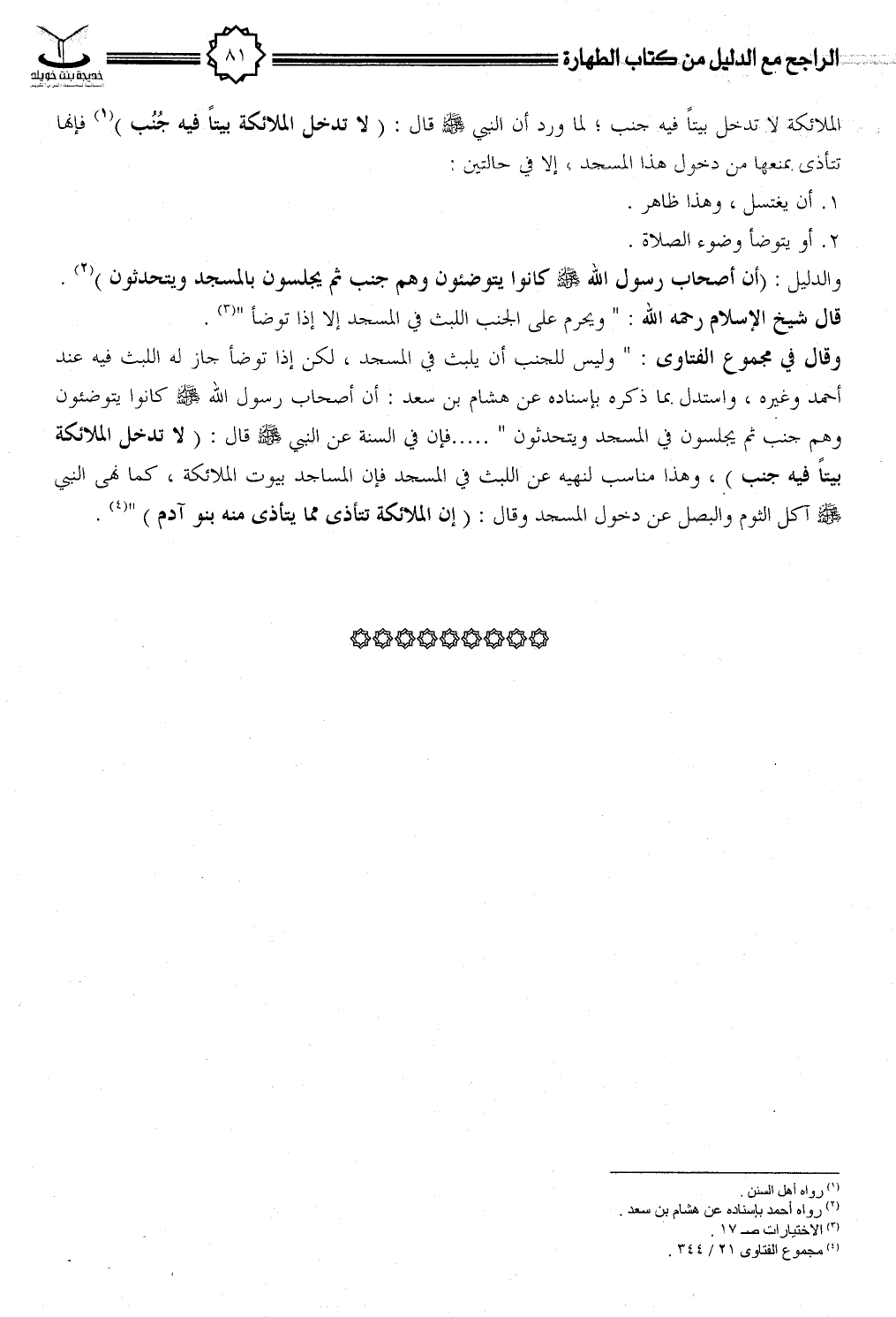 الملائكة لا تدخل بيتاً فيه جنب, ولما ورد أن النبي - قال - لا تدخل الملائكة بيتاً فيه جُنُب (¬1) - , وهذا مناسب لنهيه عن اللبث في المسجد فإن المساجد بيوت الملائكة, كما نهى النبي - آكل الثوم والبصل عن دخول المسجد وقال - إن الملائكة تتأذى مما يتأذى منه بنو آدم (¬2) -.