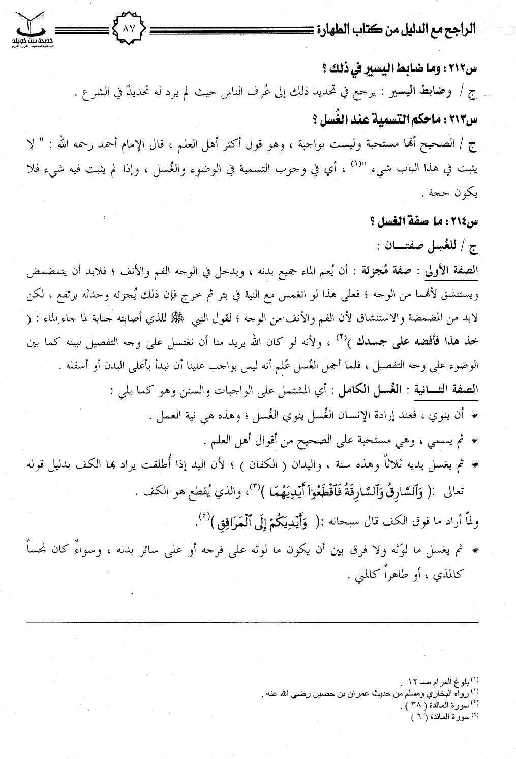 ج/ الصحيح أنها مستحبة وليست بواجبة, وهو قول أكثر أهل العلم, قال الإمام أحمد رحمه الله: (لا يثبت في هذا الباب شيء) (¬1) , أي في وجوب التسمية في الوضوء والغُسل, وإذا لم يثبت فيه شيء فلا يكون حجة.