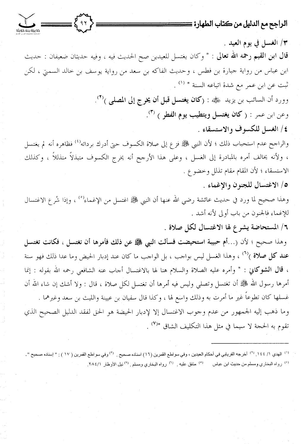 وهذا صحيح, لأن - أم حبيبة استحيضت فسألت النبي - عن ذلك فأمرها أن تغتسل, فكانت تغتسل عند كل صلاة - (¬6) , وهذا الغسل ليس بواجب, بل الواجب ما كان عند إدبار الحيض وماعدا ذلك فهو سنة, قال الشوكاني: (وأمره عليه الصلاة والسلام هنا لها بالاغتسال أجاب عنه الشافعي رحمه الله بقوله: إنما أمرها رسول الله - أن تغتسل وتصلي وليس فيه أمرها أن تغتسل لكل صلاة, قال: ولا أشك إن شاء الله أن غسلها كان تطوعاً غير ما أمرت به وذلك واسع لها, وكذا قال سفيان بن عيينة والليث بن سعد وغيرهما. وما ذهب إليه الجمهور من عدم وجوب الاغتسال إلا لإدبار الحيضة هو الحق لفقد الدليل الصحيح الذي تقوم به الحجة لا سيما في مثل هذا التكليف الشاق) (¬7).