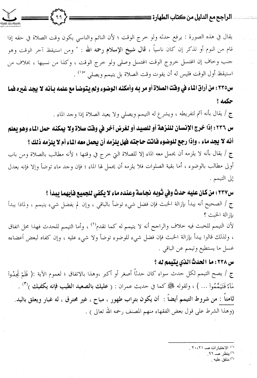 ج/ يقال بأنه لا يلزمه أن يحمل معه الماء إلا للصلاة التي خرج في وقتها, لأنه مطالب بالصلاة ومن باب أولى بالوضوء, أما بقية الصلوات فلا يلزمه أن يحمل لها الماء, فإن وجد ماء توضأ وإلا فإنه يعدل إلى التيمم.